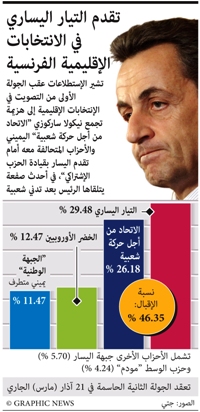 باريس / 14اكتوبر / رويترز :أظهرت استطلاعات لآراء الناخبين لدى خروجهم من مراكز الاقتراع أن حزب الرئيس الفرنسي نيكولا ساركوزي (الاتحاد من أجل الحركة الشعبية) مني بالهزيمة أمام الاشتراكيين المعارضين في الجولة الاولى من الانتخابات الاقليمية التي أجريت أمس الأول الاحد في مؤشر على أن يمين الوسط يقترب من هزيمة ثقيلة.وسعى ساركوزي للتقليل من أهمية الانتخابات قائلا انها لن يكون لها تأثير على مسيرته الاصلاحية لكن حجم الخسارة المتوقعة يمكن أن يعطي الاشتراكيين دفعة قوية بعد سنوات من الصراع الداخلي.ويزيد معدل البطالة في فرنسا على عشرة في المئة وتتعرض الماليات العامة لضغوط متزايدة كما قوض الجدل بشأن عدد من القضايا، بداية من الرواتب الباهظة للمسؤولين التنفيذيين الى الامن والهجرة، وشعبية ساركوزي.وستجرى جولة ثانية من الانتخابات في 21 مارس عندما يتواجه الحزبان اللذان يحققان أفضل نتائج في كل منطقة من مناطق فرنسا الست والعشرين في جولة اعادة حاسمة.وأظهرت نتائج الاستطلاعات التي اجرتها جماعتا اوبنيونواي و(تي.ان.اس) سوفريس أن الاشتراكيين حصلوا على 30 في المئة من الاصوات مقابل 26.5 في المئة لحزب ساركوزي وأقرب حلفائه.كما أظهرت الاستطلاعات أن الجبهة الوطنية التي تمثل أقصى اليمين حققت نتائج طيبة بشكل مفاجئ ما يعطيها الفرصة للعب دور مهم في لكن نسبة الامتناع عن التصويت قدرت بنحو 52 في المئة وهو رقم قياسي بالنسبة للانتخابات الاقليمية. وقالت الجهات التي أجرت الاستطلاعات ان انخفاض نسبة الاقبال هو على الارجح عقاب لحلفاء ساركوزي على نحو خاص مع فقدان أنصاره دوافع التصويت. وقال ساركوزي إن الانتخابات تدور حول القضايا المحلية واستبعد اي تغيير كبير في تشكيلة حكومته لكنه قال الاسبوع الماضي انه «سينتبه» لما يقوله الناخبون وان من المحتمل اجراء بعض التغييرات بالحكومة.