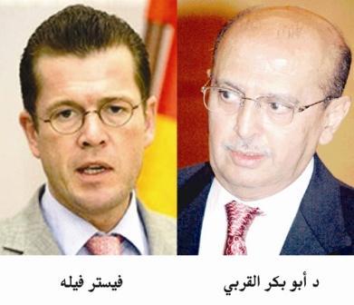 برلين / سبأ :أكد وزير الخارجية الألماني فيستر فيله دعم ألمانيا لليمن وحرصها على امن اليمن واستقراره وعدم المساس بوحدته،مشيدا بالنهج الديمقراطي الذي تنتهجه اليمن وبمستوى العلاقات المتميزة التي تربط ألمانيا باليمن. جاء ذلك خلال جلسة المباحثات اليمنية الألمانية التي عقدت يوم أمس الاثنين في مقر وزارة الخارجية الألمانية ببرلين برئاسة عن الجانب اليمني وزير الخارجية الدكتور ابو بكر القربي وعن الجانب الألماني وزير خارجية جمهورية ألمانيا الاتحادية السيد فيستر فيله .وتم خلال المباحثات بحث العلاقات اليمنية الألمانية وسبل تنميتها واستعراض القضايا الدولية والإقليمية ذات الاهتمام المشترك.كما تطرق الوزير الألماني إلى الأوضاع في صعدة وقضية النازحين مؤكدا تقدير الحكومة الألمانية لجهود الحكومة اليمنية لإطلاق سراح المختطفين الألمان في صعدة.حضر المقابلة من الجانب اليمني سفير اليمن لدى جمهورية ألمانيا الدكتور محمد لطف الارياني ورئيس دائرة أوروبا بالوزارة السفير عبدالملك الارياني ومن الجانب الألماني سعادة السفير ميشائيلس رئيس دائرة الشرق الأوسط وشمال أفريقيا في الخارجية الألمانية.
