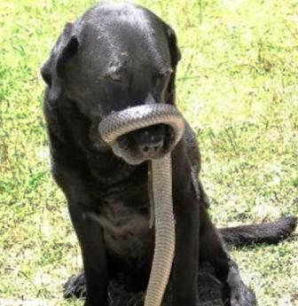 في استراليا تعرض هذا الكلب المشاكس إلى ورطة كادت تقتله لولا تدخل أصحابه في الوقت المناسب وتخليصه من قبضة الثعبان الذي قام بالالتفاف حول فمه وإغلاقه ، وتقول صاحبة الكلب أن كلبها هذا اعتاد على إحضار كل شيء يعثر عليه بجوار المنزل إليها بدافع التسلية والفضول , وتضيف ولكن هذه المرة كان الأمر مختلفا فقد احضر ثعباناً معه , وقالت بأن أول شيء قامت به هو اخذ هذه الصورة الطريفة للكلب قبل أن تقوم بتخليصه من الثعبان الذي كاد يكتم أنفاسه ، الكلب الذي نقل إلى عيادة الطبيب البيطري تبين أنه تعرض لعضة سامة من الثعبان لكنه تماثل للشفاء بعد 4 أيام وعاد إلى منزله