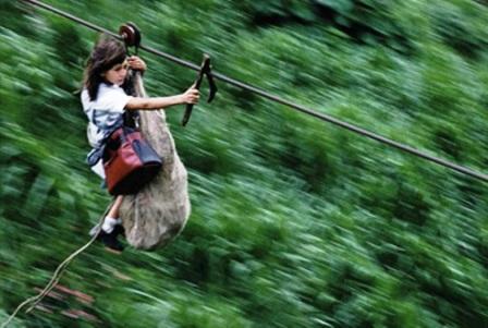 قد يمثل الذهاب للمدرسة مشكلة كبيرة للكثير من الصغار وآبائهم ، لكن الذهاب إلى المدرسة في أحد المناطق الكولومبية النائية يمثل مشكلة من نوع آخر تماماً، لأنك لكي تذهب أو ليذهب أطفالك إلى المدرسة سيكون عليهم التعلق بحبل على ارتفاع يفوق الـ400 متر والانطلاق في الهواء بسرعة تصل إلى 64 كم في الساعة.. وهذا ما يفعله بالفعل سكان هذه المنطقة التي تبعد 64 كم جنوب شرق العاصمة الكولومبية بوجوتا، لأن هذه الحبال هي وسيلة اتصالهم الوحيدة بالعالم وتصوروا أن هذه الحبال كانت مصنوعة قديماً من نبات القنب فقط ، قبل أن يقوموا باستبدالها بحبال من الاستيل!! وهذه الصورة للفتاة الصغيرة ديزي مورا ذات التسعة أعوام وهي تقوم برحلتها اليومية المعتادة إلى المدرسة!أما عن هذا الكيس الكبير الذي تحمله فهو أخوها الصغير جاميد الذي لا يستطيع التعلق في الحبال لصغر سنه، فكان الحل هو وضعه داخل كيس والتعلق به!وقد قام المصور كريستوف أوتو بالتعلق بأحد الحبال الموازية هو أيضا ليستطيع تصوير المارين!