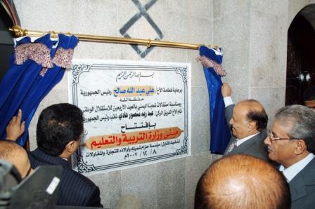 بعد ذلك قام الأخ عبدربه منصور هادي ، نائب رئيس الجمهورية بافتتاح خمس عشرة مدرسة بأمانة العاصمة وهي : مدرسة الشهيد محمد شاجره ، المجد، ابن كثير، الصعدي ، القيروان ، سلمان الفارسي ، الفرات ، الميثاق ، عمر المختار، السلام ، رفيدة ، الشهيد محسن هارون ، الملكة ، جيل الوحدة ، الإمام الشافعي ومدرسة حي الأندلس بمديرية معين . وتحتوي هذه المدارس التي بلغت تكلفتها الاستثمارية نحو مليار و200 مليون و685 ألف ريال ، على 249 فصلا دراسيا مع عشرة معامل فيزياء وكيمياء وثمان مكتبات وخمسة عشر إدارة وثلاثين مكتبا للوكلاء والمدرسين واثني عشر مخزن كتب واثني عشر أرشيفاً وست صالات متعددة الأغراض مع الخدمات والمرافق الأخرى .وبعد أن أزاح الاخ نائب الرئيس ، الستار عن اللوحة التذكارية بمناسبة افتتاح هذه المشاريع استمع الى شرح من الاخ محمد عبد الله الفضلي مدير عام مكتب التربية والتعليم بأمانة العاصمة، حول طبيعة تجهيزات هذه المدارس وحجم استيعابها للطلاب ، مشيرا الى السعي الحثيث للتخفيف من حالات الإزدحام والتقليل من عدد الطلاب في الفصل الواحد من خلال التوسع في المبنى المدرسي النموذجي. بعد ذلك قام الأخ نائب الرئيس بافتتاح مدرسة الفرات ، حيث تجول ببعض فصولها للإطلاع على طبيعة الترتيبات الجديدة لتوزيع الطلاب على الفصول الدراسية بأعداد قليلة لتمكينهم من الاستيعاب بصورة افضل .ووجه الجهات المعنية بمتابعة التوسعات الخاصة بالمدارس الأساسية والثانوية وتطوير أساليب العمل التربوي بما يمكن من تلبية متطلبات الجيل الجديد ، مؤكدا ان فخامة الرئيس علي عبد الله صالح رئيس الجمهورية يتابع باهتمام كبير هذه النواحي الأساسية لإعداد جيل اليوم من أجل الغد المشرق .حضر افتتاح هذه المشاريع التربوية والتعليمية الاخوة: محمد عبدالله زبارة وحسن صالح باعوم وعبد الكريم الجنداري ومنصور الصلوي وكلاء وزارة التربية والتعليم وأحمد عبد الله العوذلي مدير عام جهاز محو الأمية وتعليم الكبار ورؤساء القطاعات والهيئات ومدراء العموم والكوادر التربوية والفنية بالوزارة.