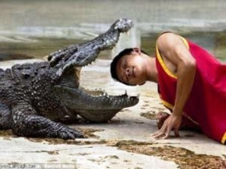 بانكوك / متابعات : قد لا يبدو العمل اليومي المضني في المكتب ، سيئاً للغاية بعد مشاهدة هذه الصور المذهلة، فمهما كان رئيسك في العمل كثير التبرم، فإنك ستشعر بالكثير من الارتياح لأنك على الأقل لا تخاطر بحياتك بوضع رأسك بين فكي تمساح.ولكن هذا هو بالضبط ما يفعله مصارعو التماسيح في حديقة حيوان تايلاندية على أساس يومي، وتظهر سلسلة من الصور المذهلة الرجال في الحديقة الموجودة داخل حظيرة سامفران للأفيال البرية وهم ينكبون على أداء ما قد يكون أخطر وظيفة في العالم .وظل الحراس يؤدون هذه الأعمال المثيرة في الحديقة التي تضم أكثر من 10 آلاف تمساح والواقعة على مشارف بانكوك منذ تأسيسها في عام 1985، و خلال العرض الذي يستمر لمدة ساعة يضع الحراس رؤوسهم بين فكي بعض من أكبر التماسيح بالحديقة.ويقول المصور برونيك كامنسكي، الذي شهد المغامرة الفذة خلال رحلة إلى الحظيرة:” التماسيح نشيطة جداً ولا تكون نصف نائمة أثناء العرض، وعادة ما تقضم عصياً من الخيزران بصوت عالٍ أو تعض عليها ثم تتم استثارتها قبل أن يضع الرجال رؤوسهم في أفواهها ويبقوها هناك لفترة طويلة.