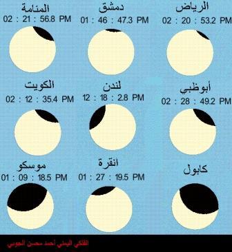 عادل خدشي / عدن:قال الفلكي اليمني فضيلة العلامة القاضي أحمد محسن الجوبي: اليوم الجمعة الأول من أغسطس 2008م سيجتاح كسوف (74) دولة على مستـــــوى العالم.. وهي :الأردن والكويت وأيسلندا وباكستان وتركيا وصربيا وقيرغيزيا وموناكو والإمارات والمالديف وأرمينيا وبريطانيا وجورجيا وطاجيكستان ولاتفيا وميانمار والبحرين والنرويج وألبانيا وبلجيكا وروسيا وعمان ولاوس وهنغاريا والبوسنة والهرسك والنمسا وألمانيا وبلغاريا ورومانيا وفرنسا ولبنان وهولندا والتشيك والنيبال وإذربيجان وبنجلادش وسان مارينو وفنلندا ولوكسمبورغ والدانمارك والهند وإستونيا وبوتان وسريلانكا وقبرص وليتوانيا والسعودية واليونان وفلسطين وبولندا وسلوفاكيا وقطر وليختنشتاين والسويد وأوزبكستان وأفغانستان وبيلاروسيا وسلوفينيا وكازاخستان ومقدونيا والصين واوكرانيا وإيران وتايلاند وسوريا وكرواتيا ومنغوليا والعراق وأيرلندا وإيطاليا وتركمانستان وسويسرا وكندا ومولدوفا.وأوضح في تصريح لـ ((14 أكتوبر)) إلى الكسوف الجزئي للشمس في (10) دول عربية في اليوم نفسه، وهي : السعودية وعُمان والإمارات وقطر والبحرين والكويت والعراق والأردن وسوريا ولبنان وكذلك سيكون جزئياً على أوروبا وآسيا.وأضاف أنّ الشمس ستكشف كلياً على التاي ولوينج (الصين) وبرنول ونوفو سيبريسك (روسيا).. موضحاً أنْ مركز الكسوف الكلي على منطقة روسية مساحتها 56,074 كم2 عند الساعة الواحدة وواحد وعشرين دقيقة و2,33287456 ثانية بعد الظهر بتوقيت العاصمة اليمنية صنعاء، حيث سيستمر الكسوف الكلي في سمائها على مدى دقيقتين وسبعٍ وعشرين ثانية، ولن تعود هذه الظاهرة على هذه المنطقة إلا بعد (481) سنة شمسية.وأشار إلى أنّ بداية الكسوف سيكون من جزيرة نيو فاوند لاند الكندية في تمام الساعة الحادية عشر صباحاً وأربع دقائق و00,3554 ثانية بتوقيت صنعاء، وأضاف أنّ بداية الكسوف الكلي للشمس سيكون من شمال كندا في تمام الساعة الثانية عشرة ظهراً وعشرين دقيقة و59,8756 ثانية، حيث سينتهي الكسوف الكلي في منطقة (وهان) الصينية، في تمام الساعة الثانية ظهراً وإحدى وعشرين دقيقة و23,8114 ثانية، حيث سينتهي الكسوف في منطقة بحرية شرق تيرو شيرا بالي الهندية في تمام الساعة الثالثة عصراً وثمانية وثلاثين دقيقة و22,7 ثانية وسرعة الكسوف الجزئي حينئذٍ سيكون 2644 كم في الساعة، وسرعة الكسوف الكلي حينئذٍ ستكون 4244 كم في الساعة.وأوضح في سياق تصريحه أنّ اصطفافاً مستوياً يشمل الأرض والقمر والشمس سيحدث اليوم الجمعة في تمام الساعة الثانية عشرة ظهراً وسبع وأربعين دقيقة و17,5 ثانية بتوقيت العاصمة صنعاء.. مشيراً إلى أنّ سماء اليمن لن يحدث فيها كسوف الشمس، إلا في الحدود اليمنية مع عُمان، حيث سينكسف بنسبة 2,4 % من قرص الشمس على منطقة شحن الواقعة في محافظة المهرة شرق اليمن في تمام الساعة الثانية بعد الظهر وأربعون دقيقة بتوقيت صنعاء، وبنسبة أقل من 1 % على حوف في محافظة المهرة أيضاً في تمام الساعة الثانية بعد الظهر واثنتين وأربعين دقيقة، وكذلك لن يحدث كسوف على مكة المكرمة، جدة، الطائف، البحر الأحمر، قارة أفريقيا، إسبانيا، البرتغال، صقلية، الولايات المتحدة الأمريكية، وأمريكا الجنوبية واليابان.وفي ختام تصريحه قال فضيلة العلامة الجوبي : ((إنّ المساحة الإجمالية لكسوف الشمس من أوله إلى آسخره بشقيه الكلي والجزئي 146 مليون كم2)).