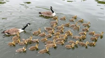 في كندا وفي هذه الصورة الطريفة وجدت إوزة نفسها مسؤولة عن تربية 40 من الفراخ واحدة, ويقول الخبراء إن الفراخ لا تخص هذه الإوزة لوحدها ، وإنما تعود إلى أمهات أخريات ولكن طبيعة الازدحام بين أعداد الإوز الكبير تجعلها تبيض وتفقس في مناطق قريبة من بعضها البعض ويحدث الاختلاط بين الفراخ التي تتبع بعضها لتتجمع بالقرب من أم واحدة ، بينما تذهب باقي الأمهات بعيدا عن صيصانهن التي تؤول تربيتهن إلى إوزة مسكينة واحدة .