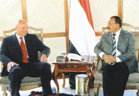 صنعاء /سبأ: استقبل فخامة الاخ الرئيس علي عبدالله صالح رئيس الجمهورية أمس ميشيل كلور بير شتولد سفير جمهورية المانية الاتحادية بصنعاء, حيث جرى تناول العلاقات ومجالات التعاون المشترك بين اليمن والمانيا بالاضافة الى بحث ترتيبات الزيارة التي من المقرر ان يقوم بها فخامة الاخ الرئيس على عبد الله صالح رئيس الجمهورية الى المانيا في أواخر شهر فبراير الحالي، وبما يكفل لها النجاح وتحقيق الاهداف المنشودة منها وتعزيز العلاقات الثنائية والدفع بمجالات التعاون المشترك بين البلدين.وقد اكد فخامة الاخ الرئيس حرص اليمن على تعزيز وتطوير علاقاتها مع المانيا.. مشيدا بما تقدمه جمهورية المانيا الاتحادية من مساعدات لدعم مسيرة التنمية والديمقراطية في اليمن.. حضر اللقاء امين عام رئاسة الجمهورية عبدالله حسين البشيري.