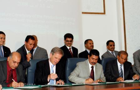 وقال إن كثيراً من الجهات الدولية شاركت في إعداد وتجهيز الاتفاقيات، منها مصر وسوريا والبنك الدولي وخبراء بريطانيون، فضلا عن الخبراء المحليين في وزارة النفط والمعادن.. معربا عن ثقته في أن تكون نتائج هذه الاتفاقات مثمرة بعد بدء الاستكشاف والإعلان عن الإنتاج.. ولفت إلى أن الشركات الهندية تميزت بالحضور بشكل ملحوظ في هذه المنافسة..مشيرا إلى أن بعض القطاعات تميزت بنوعية الشركاء فيها، حيث لوحظ وجود شركات عربية وباكستانية ونمساوية وبين أن تجربة اليمن في مجال استكشاف وانتاج النفط خلال العشرين سنة الماضية تجربة متميزة وفريدة في عدد من القطاعات.. مؤكدا أن المستقبل مبشر بالخير باعتبار أن حجم الاستثمارات بهذا القطاع مازال في مراحل مبكرة جدا وهناك قطاعات كثيرة مازالت واعدة .. وأكد أن وزارة النفط والمعادن تسعى إلى وقف التأرجح في عملية انتاج النفط ورفع الإنتاج إلى 500 ألف برميل يوميا مع بداية العام 2010م وذلك من خلال دخول قطاعات بترولية جديدة في عملية الإنتاج وكذا وجود عناصر جديدة في قطاع البترول وهو الغاز .ولفت إلى أنه سيتم نهاية الشهر الجاري تسليم استمارات العطاء للشركات البترولية المتقدمة للمنافسة الدولية الرابعة وذلك بحضور مندوبين عن تلك الشركات وسوف تستكمل المنافسة بشكلها النهائي في 31 يوليو من العام الجاري، حيث ستبدأ الوزارة بالإجراءات الدستورية لاستكمال هذه المنافسات.وأعرب بحاح عن أمله في أن يتم التوقيع على الاتفاقيات القادمة خلال العام 2008م الجاري، مبينا أنه تم في وقت سابق من العام الجاري التوقيع على أربع اتفاقيات بترولية في إطار المنافسة الدولية الثانية.وقال إن وزارة النفط والمعادن تطمح إلى تسويق 11 قطاعا بحريا خلال العام الجاري ليشهد بذلك العام 2008 م التوقيع على أكبر قطاعات بترولية في تأريخ الجمهورية اليمنية .. مشيرا إلى أن هذه الاتفاقيات ليست نمطية لكنها تتضمن كثيراً من البنود الاستثمارية المشجعة في القطاع البترولي .من جانبه أوضح رئيس هيئة استكشاف وإنتاج النفط الدكتور أحمد علي عبدالاله أن الاتفاقات الموقعة تتميز بأنها في مناطق واعدة وأخرى جديدة في محافظات الجوف وشبوة وحضرموت والمهرة ومعظمها خارج المناطق التي تم اكتشاف البترول فيها سابقا في المسيلة ومأرب وشبوة .ونوه أحمد عبدالاله بأن ذلك التواجد الكبير لكبرى الشركات العالمية في هذا المجال يعكس قدرة اليمن على تسويق قطاعات كثيرة في مناطق مختلفة وبسياسات محددة، مشيرا إلى أن اليمن تعد من المواقع الجديدة الجاذبة للاستثمارات العالمية في هذه المجال.حضر مراسم التوقيع وكيل هيئة استكشاف وإنتاج النفط نصر الحميدي ومستشار وزير النفط والمعادن نجيب الشرفي وعدد من المسؤولين في الوزارة وممثلون عن الشركات الفائزة .من جانب آخر تبدأ شركة سنوبيك الصينية النفطية خلال الأيام القليلة القادمة أعمال المسوحات الجيوفيزيائية في القطاع النفطي (1 ) بطول( 350 ) كيلومتر بمحافظة شبوة . وكان محافظ شبوة محمد علي الرويشان بحث أمس مع مدير عام الشركة باليمن / ووتسي مين / تعزيز أشكال التعاون والتنسيق بين المحافظة والشركة ، بما يساعد الشركة في تنفيذ وتسيير أنشطتها الاستكشافية النفطية في القطاعين ( 1 ) و ( 69 ) بالمحافظة بصورة جيدة وبحسب الخطط والبرامج المرسومة.وأكد الرويشان حرص قيادة المحافظة والفعاليات الرسمية والشعبية على تقديم كافة أشكال الدعم والمساعدة للشركة بما يسهل تنفيذ أنشطتها وأعمالها الاستكشافية في مجال النفط بالمحافظة على أكمل وجه، وفقا للتوجهات الرامية إلى تشجيع كافة اعمال الاستثمار في المحافظة واليمن عموما. وأكد المحافظ الرويشان على ضرورة التنسيق والتعاون بين المحافظة والشركة الصينية خاصة ما يتعلق بتوفير العمالة المحلية والخدمات التي تحتاجها الشركة أثناء فترة عملها بالمحافظة وكذا التنسيق فيما يتعلق بالحفاظ على البيئة المحلية .من جانبه عبر مدير عام شركة سنوبيك الصينية النفطية عن التقدير للتعاون الذي تلاقيه الشركة من قيادة ا