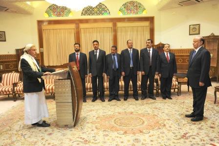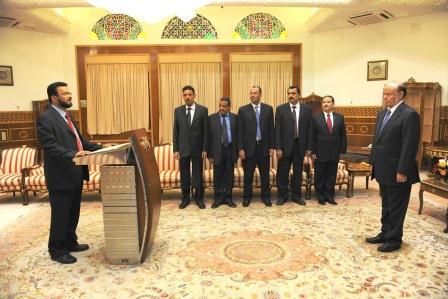 صنعاء / سبأ:أدى اليمين الدستورية أمس أمام الأخ عبد ربه منصور هادي رئيس الجمهورية في دار الرئاسة وزير التعليم العالي والبحث العلمي المهندس هشام شرف عبد الله ووزير النفط والمعادن المهندس أحمد عبدالله دارس ومحافظ صنعاء عبد الغني حفظ الله جميل ومحافظ البيضاء الظاهري الشدادي ومحافظ شبوة أحمد علي سالم باحاج ومحافظ الجوف محمد سالم بن عبود ومحافظ عمران محمد حسن دماج.