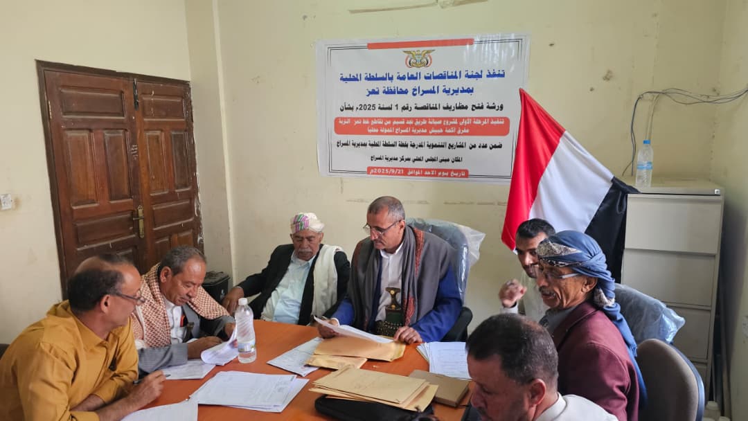 ترأس مدير عام مديرية المسراخ بمحافظة تعز، رئيس الهيئة الإدارية ولجنة المناقصات العامة بالمجلس المحلي المحامي، فارس المليكي، اجتماعاً ضم أعضاء لجنة فتح مظاريف المناقصة العامة رقم (1) لسنة 2025م، الخاصة بتنفيذ المرحلة الأولى من مشروع صيانة طريق نجد قسيم من تقاطع خط تعز - التربة باتجاه مدخل خط المسراخ الرئيسي، بتمويل محلي ذاتي من المجلس المحلي بالمديرية.