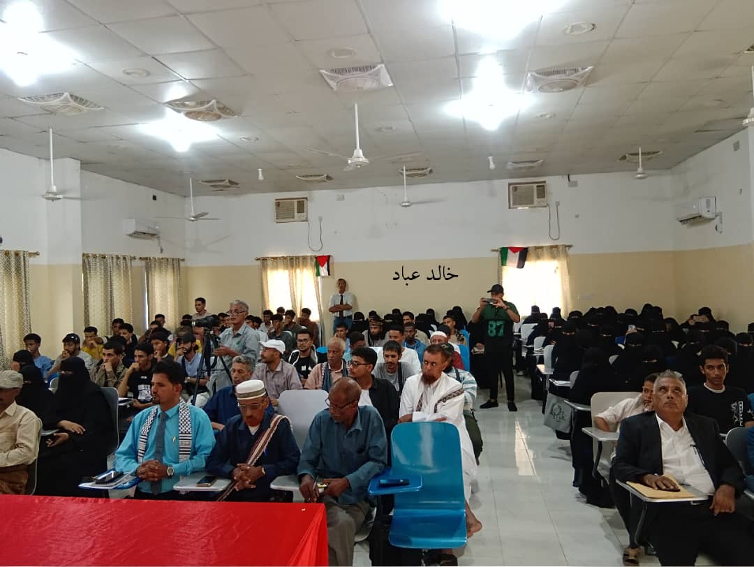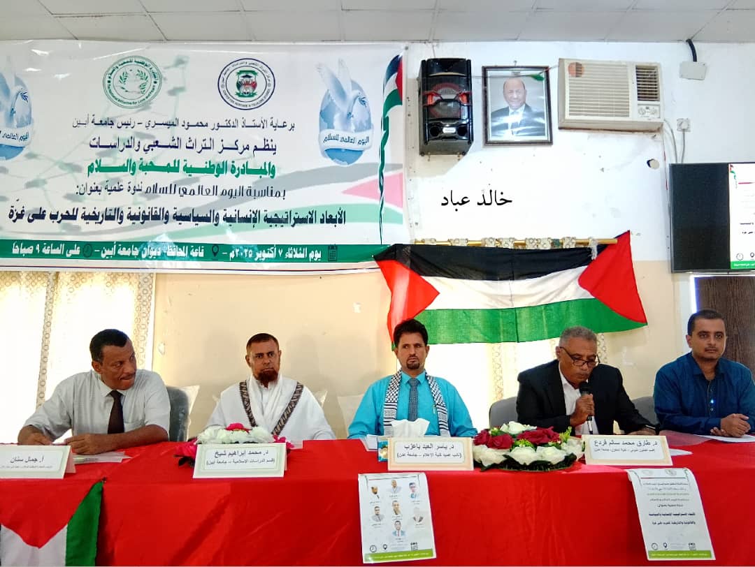 نظم مركز التراث الشعبي والدراسات بجامعة أبين والمبادرة الوطنية للمحبة والسلام،اليوم، بقاعة المحافظ في ديوان عام الجامعة بمدينة زنجبار، مركز محافظة أبين، ندوة علمية عن "الأبعاد الاستراتيجية الإنسانية والسياسية والقانونية والتاريخية للحرب التي يشنها الاحتلال الصهيوني ضد الشعب الفلسطيني في قطاع غزة"، بمناسبة اليوم العالمي للسلام، وبرعاية رئيس جامعة أبين الدكتور محمود الميسري وبحضور وكيل محافظة أبين لشؤون التعليم د. عبد العزيز الحمزة.