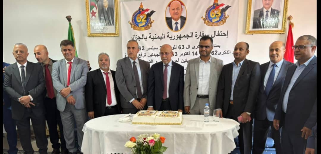 نظمت السفارة اليمنية في الجزائر، اليوم، احتفالاً بمناسبة الذكرى الـ 63 لثورة السادس والعشرين من سبتمبر، والذكرى الـ 62 لثورة الرابع عشر من أكتوبر المجيدتين.