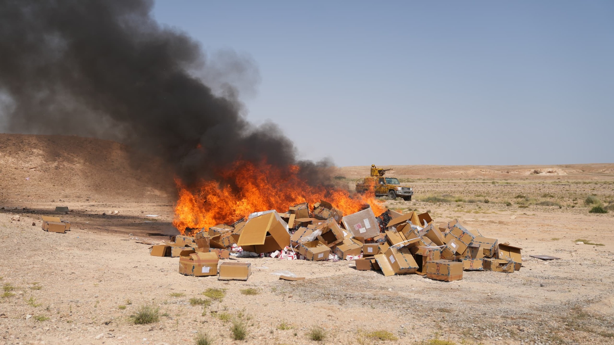 جرى اليوم في مديرية حوف بمحافظة المهرة، إتلاف كميات كبيرة من الأدوية المهربة والحشيش والخمور، بعد استكمال الإجراءات القانونية اللازمة بحقها، وذلك بحضور ممثلين عن النيابة العامة والأجهزة الأمنية.