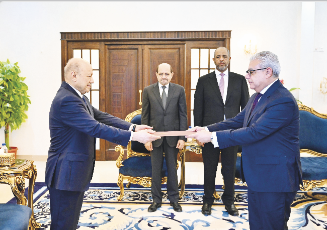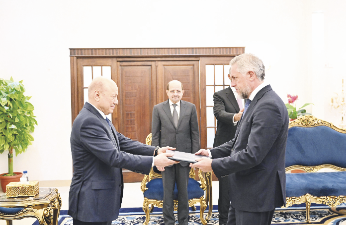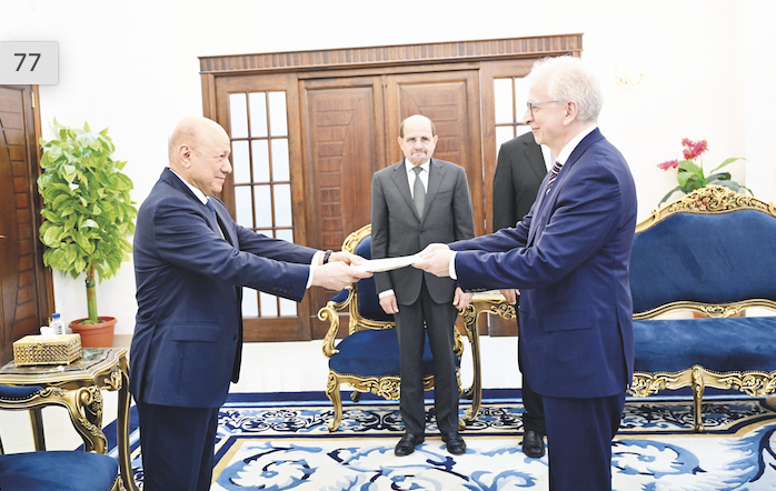 تسلّم الرئيس الدكتور رشاد محمد العليمي، رئيس مجلس القيادة الرئاسي، في قصر معاشيق بالعاصمة المؤقتة عدن، أوراق اعتماد سفراء كل من جمهورية مصر العربية، إيهاب احمد أبو سريع، وجمهورية ألمانيا الاتحادية، توماس فريدريش، والاتحاد الأوروبي، باتريك سيمونيه، والجمهورية الإسلامية الموريتانية، محمد الأمين ابراهيم، وجمهورية البرازيل الاتحادية، باولو اوشوا فيليو.