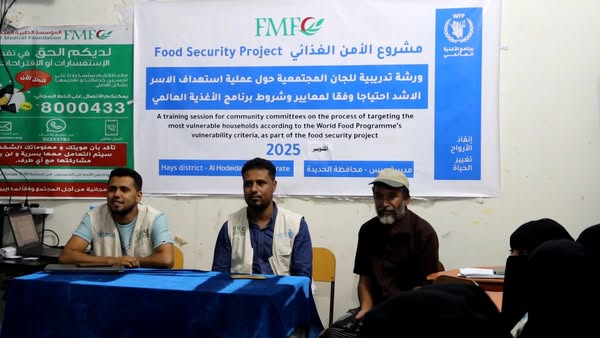 نظّمت المؤسسة الطبية الميدانية (FMF)، الشريك المنفذ لبرنامج الأغذية العالمي، ورشة تدريبية للجان المجتمعية بالتنسيق مع السلطة المحلية في مديرية حيس بمحافظة الحديدة، بهدف تعزيز قدراتهم في عملية استهداف الأسر الأشد احتياجاً وفقاً لمعايير البرنامج.