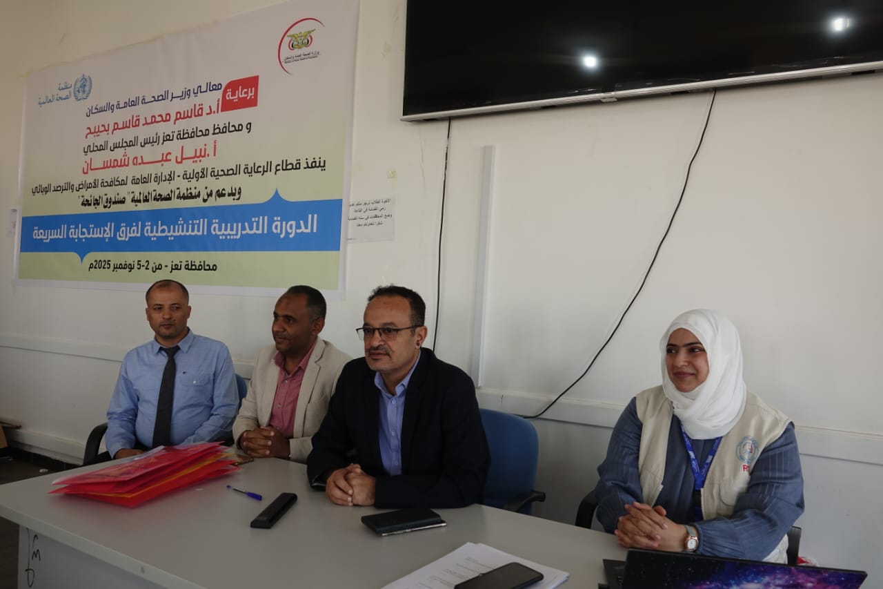 دشن مكتب الصحة العامة والسكان بمحافظة تعز، اليوم، الدورات التدريبية التنشيطية لفرق الاستجابة السريعة في المديريات، التي تنفذها إدارة الأمراض والترصد الوبائي بالتعاون مع إدارة التثقيف والإعلام الصحي والمختبر المركزي.