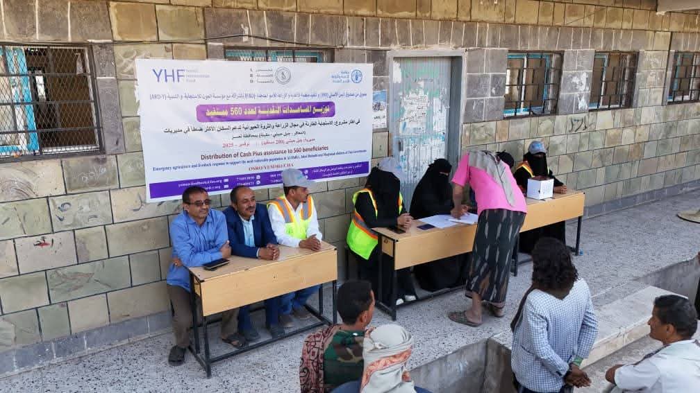 في خطوة إنسانية تعزز الأمن الغذائي وتدعم صمود الأسر الريفية دشنت السلطة المحلية في مديرية جبل حبشي بمحافظة تعز مشروع توزيع المساعدات النقدية للأسر الأشد ضعفًا بتمويلٍ من صندوق اليمن الإنساني (YHF) وتنفيذ منظمة الأغذية والزراعة للأمم المتحدة (FAO) بالشراكة مع مؤسسة العون للاستجابة والتنمية
