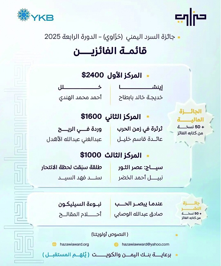 حصدت الروايتان “إينشا” لخديجة بابطاح، و”خلل” لأحمد الهندي؛ المركز الأول، في الموسم الرابع، من “حَزَاوِي” جائزة السردي اليمني للروايات المخطوطة غير المنشورة ، للعام 2025م ، وتقاسمت أربع روايات المركزين الثاني والثالث في الجائزة المالية، كما تشاركت روايتان في جائزة النشر.