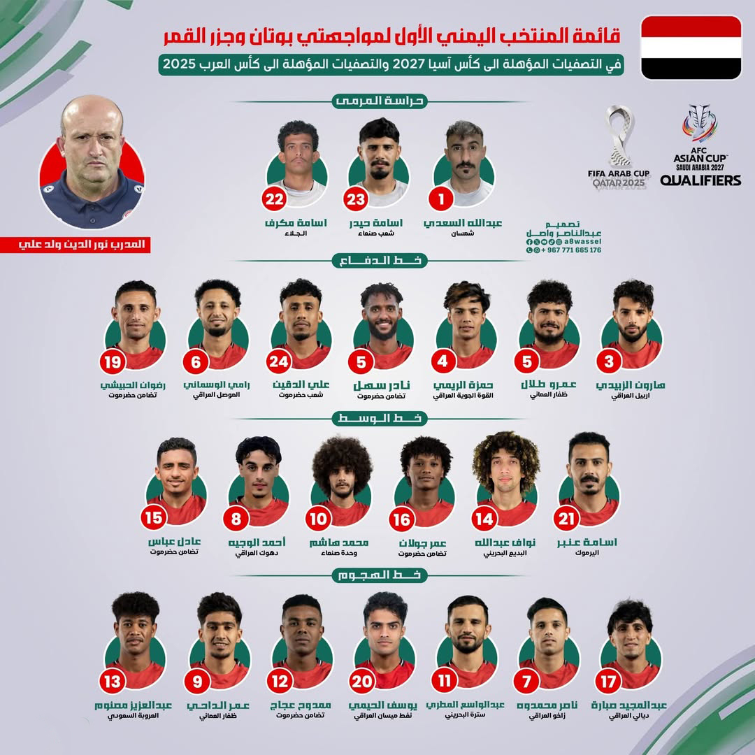 وقال مدرب منتخبنا الوطني الأول، الجزائري نور الدين ولد علي، أقر القائمة النهائية للاعبي المنتخب والتي تضم 23 لاعباً للمشاركة في الاستحقاقات الخارجية القادمة.