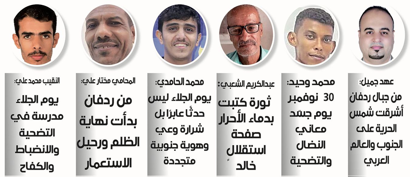 يوم الجلاء الثلاثون من نوفمبر اليوم الذي انتصرت فيه ارادة الشعب الجنوبي ضد المستعمر البريطاني ، يمثل هذا اليوم عبق التاريخ وروح التحدي التي فجّرها أبناء الجنوب ضد الاستعمار البريطاني الذي جثم على صدورهم لأكثر من 129 عامًا.. فبعد اربع سنوات من انطلاق ثورة 14 اكتوبر أعلن ميلاد الحرية وبداية النهاية لأعتى إمبراطورية في العالم، لتُكتب صفحة مجيدة في سجل النضال الجنوبي.. بهذه المناسبة الخالدة، أجرت صحيفة “14 أكتوبر” عددًا من اللقاءات مع شخصيات وطنية واجتماعية استحضرت معاني الثورة ومآثر أبطالها وتضحياتهم الجسيمة.