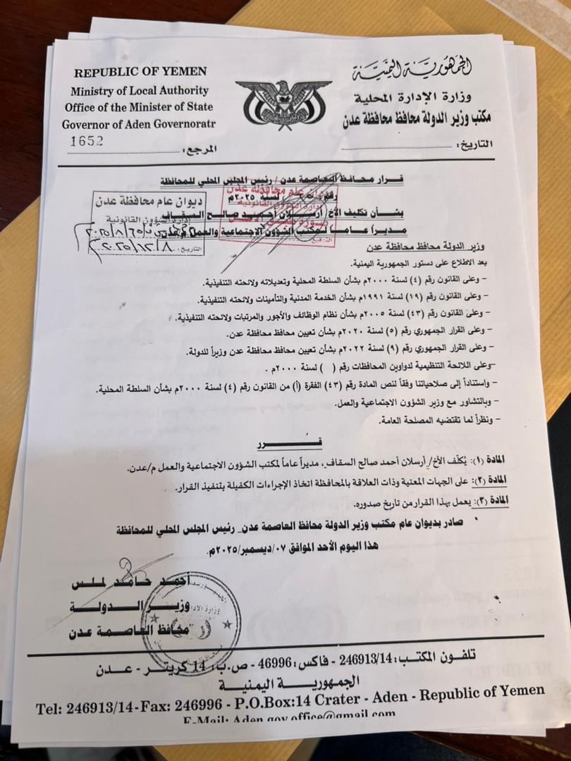 عدن/14أكتوبر/ خاص:أصدر محافظ العاصمة عدن – وزير الدولة، أحمد حامد لملس، قراراً إدارياً قضى بتعيين أرسان أحمد صالح السقاف مديراً عاماً لمكتب الشؤون الاجتماعية والعمل في العاصمة عدن. ونصت مواد القرار الثانية والأخرة عى تكليف الجهات المعنية ذات العلاقة في المحافظة باتخاذ الإجراءات اللازمة لتنفيذه فوراً، مع العمل بأحكامه اعتباراً من تاريخ صدوره.هذا وتم اليوم تنفيذ عملية التسليم والتسلُّم الرسمية بين المدير السابق الدكتور محمد حمود أحمد والمدير الجديد أرسلان السقاف، بحضور لجنة الاستلام والتسليم المكلفة. ويُعتبر أرسلان السقاف من القيادات الشابة في المحافظة، وسبق له أن تولى مسؤولية قيادة مكتب الشؤون الاجتماعية والعمل بعدن - مؤقتاً، بعد وفاة المدير السابق المغفور له بإذن الله تعالى أيوب أبوبكر، حيث حظيت فترة توليه السابقة بتقدير لجهوده في قيادة المكتب.