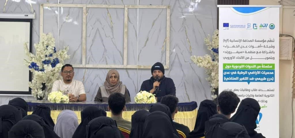 عدن /14أكتوبر/ خاص:نظمت مؤسسة الصحافة الإنسانية (HJF)وشبكة أصوات عدن الخضراء ندوة توعوية بعنوان “محميات الأراضي الرطبة في عدن درع طبيعي ضد التغير المناخي”.وقدمت الندوة الدكتورة ندى السيد حسن أحمد أستاذ علوم الحياة والبيئة بجامعة عدن حيث استعرضت محاورعلمية هامة شملت تعريف الأراضي الرطبة وأنواعها وكيفية عملها كمرشحات طبيعية، مع تقديم تحليل دقيق لوضعها الحالي وأسباب تقلصها. وتناولت الدكتورة ندى دور هذه المحميات في مكافحة التغير المناخي ومعالجة تدهور النظم البيئية الهشة مؤكدة على أهمية رفع الوعي المجتمعي ووضع توصيات عمليةلحمايتها.وتخلل الفعالية عرض فيلم وثائقي بعنوان “درع عدن”، تناول الأهمية الاستراتيجية لهذه النظم البيئية في حماية المدينة من الفيضانات والسيول وسبل الحفاظ عليها وسط حضور لافت تجاوز 70 طالباً وطالبة من كليتي التربية والعلوم بجامعة عدن.تأتي هذه الندوة ضمن أنشطة مشروع “أصوات عدن الخراء الذي تنفذه المؤسسة بالشراكة مع منظمة “سيفرورلد” (SAFERWORLD)وبتمويل من الاتحاد الأوروبي وبالتنسيق مع الهيئة العامة لحماية البيئة فرع عدن.