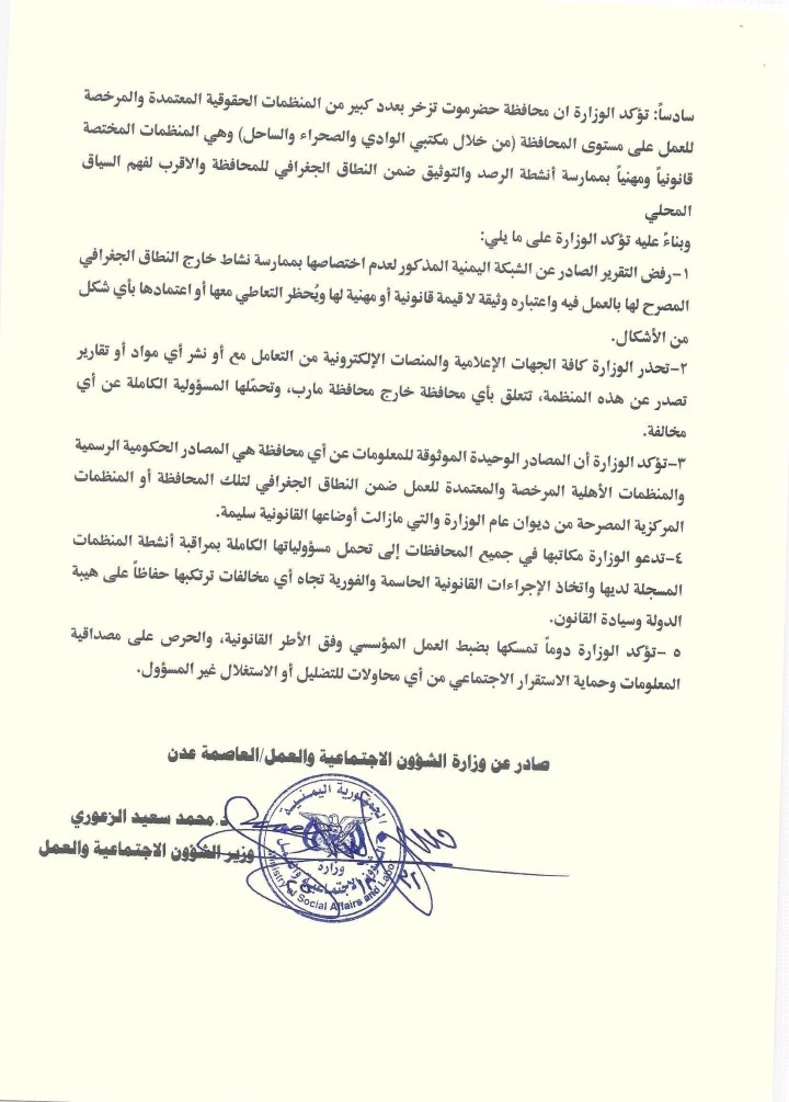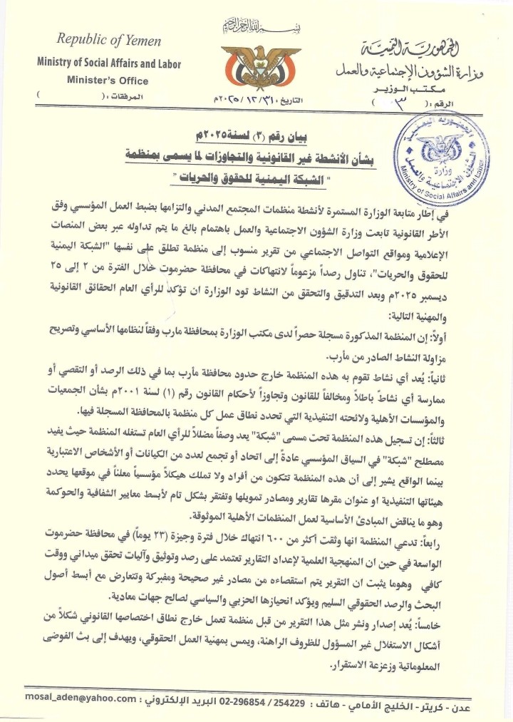 أولاً: إن المنظمة المذكورة مسجلة حصراً لدى مكتب الوزارة بمحافظة مارب وفقا لنظامها الأساسي وتصريح مزاولة النشاط الصادر من مأرب.ثانياً: يُعد أي نشاط تقوم به هذه المنظمة خارج حدود محافظة مأرب بما في ذلك الرصد أو التقصي أو ممارسة أي نشاط باطلاً ومخالفاً للقانون وتجاوزاً لأحكام القانون رقم (1) لسنة ٢٠٠١م بشأن الجمعيات والمؤسسات الأهلية ولائحته التنفيذية التي تحدد نطاق عمل كل منظمة بالمحافظة المسجلة فيها.ثالثاً: إن تسجيل هذه المنظمة تحت مسمى "شبكة" يعد وصفاً مضللاً للرأي العام تستغله المنظمة حيث يفيد مصطلح "شبكة" في السياق المؤسسي عادة إلى اتحاد أو تجمع لعدد من الكيانات أو الأشخاص الاعتبارية بينما الواقع يشير إلى أن هذه المنظمة تتكون من أفراد ولا تملك هيكلاً مؤسسياً معلناً في موقعها يحدد هيئاتها التنفيذية او عنوان مقرها تقارير ومصادر تمويلها وتفتقر بشكل تام لأبسط معايير الشفافية والحوكمة وهو ما يناقض المبادئ الأساسية لعمل المنظمات الأهلية الموثوقة.رابعاً: تدعي المنظمة انها وثقت أكثر من ٦٠٠ انتهاك خلال فترة وجيزة (۲۳) يوماً) في محافظة حضرموت الواسعة في حين ان المنهجية العلمية لإعداد التقارير تعتمد على رصد وتوثيق وآليات تحقق ميداني ووقت كافي وهوما يثبت ان التقرير يتم استقصاءه من مصادر غير صحيحة ومفبركة وتتعارض مع أبسط أصول البحث والرصد الحقوقي السليم ويؤكد انحيازها الحزبي والسياسي لصالح جهات معادية.خامساً: يُعد إصدار ونشر مثل هذا التقرير من قبل منظمة تعمل خارج نطاق اختصاصها القانوني شكلاً من أشكال الاستغلال غير المسؤول للظروف الراهنة، ويمس بمهنية العمل الحقوقي، ويهدف إلى بث الفوضى المعلوماتية وزعزعة الاستقرار.سادساً: تؤكد الوزارة ان محافظة حضرموت تزخر بعدد كبير من المنظمات الحقوقية المعتمدة والمرخصة للعمل على مستوى المحافظة من خلال مكتبي الوادي والصحراء والساحل وهي المنظمات المختصة قانونياً ومهنياً بممارسة أنشطة الرصد والتوثيق ضمن النطاق الجغرافي للمحافظة والاقرب لفهم السياق المحليوبناء عليه تؤكد الوزارة على ما يلي:1 - رفض التقرير الصادر عن الشبكة اليمنية المذكور لعدم اختصاصها بممارسة نشاط خارج النطاق الجغرافي المصرح لها بالعمل فيه واعتباره وثيقة لا قيمة قانونية أو مهنية لها ويُحظر التعاطي معها أو اعتمادها بأي شكل من الأشكال.تحذر الوزارة كافة الجهات الإعلامية والمنصات الإلكترونية من التعامل مع أو نشر أي مواد أو تقارير تصدر عن هذه المنظمة تتعلق بأي محافظة خارج محافظة مارب، وتحملها المسؤولية الكاملة عن أي مخالفة.تؤكد الوزارة أن المصادر الوحيدة الموثوقة للمعلومات عن أي محافظة هي المصادر الحكومية الرسمية والمنظمات الأهلية المرخصة والمعتمدة للعمل ضمن النطاق الجغرافي لتلك المحافظة أو المنظمات المركزية المصرحة من ديوان عام الوزارة والتي مازالت أوضاعها القانونية سليمة.- تدعو الوزارة مكاتبها في جميع المحافظات إلى تحمل مسؤولياتها الكاملة بمراقبة أنشطة المنظمات المسجلة لديها واتخاذ الإجراءات القانونية الحاسمة والفورية تجاه أي مخالفات ترتكبها حفاظاً على هيبة الدولة وسيادة القانون.ه - تؤكد الوزارة دوماً تمسكها بضبط العمل المؤسسي وفق الأطر القانونية، والحرص على مصداقية المعلومات وحماية الاستقرار الاجتماعي من أي محاولات للتضليل أو الاستغلال غير المسؤول.