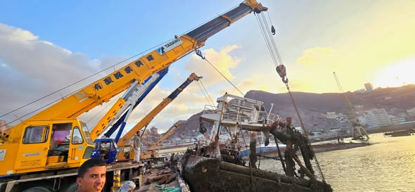 انتشال ثاني أكبر سفينة غارقة في ميناء الاصطياد السمكي بعدن