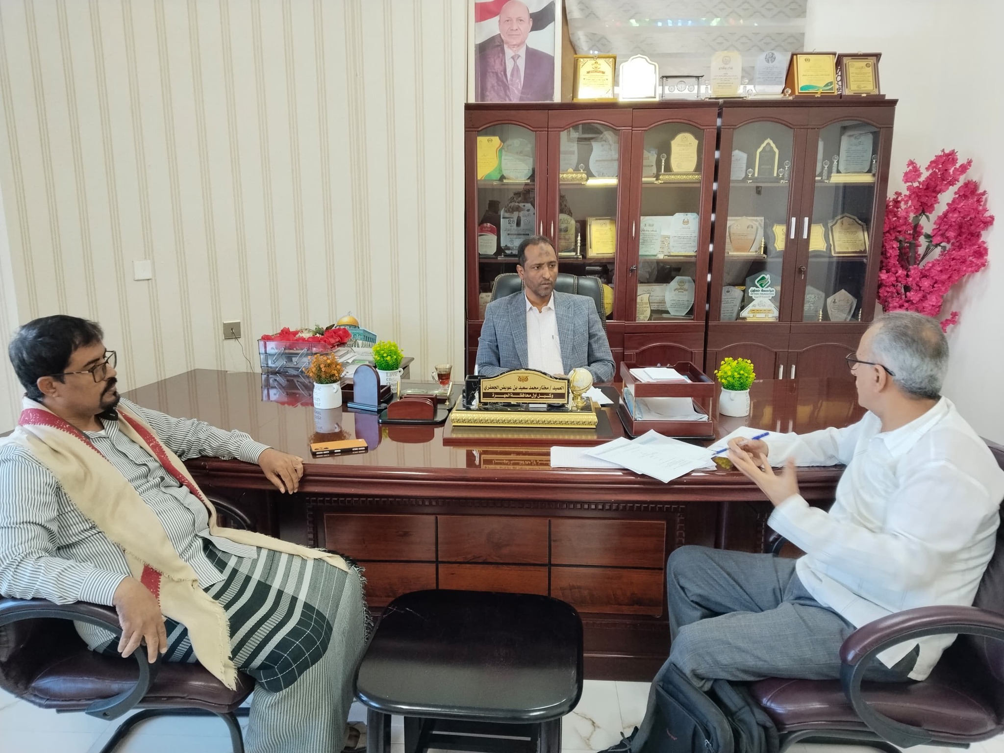المهرة/14أكتوبر/خاص:عقد وكيل أول محافظة المهرة، العميد دكتور مختار بن عويض الجعفري، اليوم ، لقاءً رسميا بمكتبه ، مع ممثل برنامج الأمم المتحدة الإنمائي (UNDP) الدكتور هيف أحمد غانم، لمناقشة آفاق التعاون المشترك في مجال إدارة الأزمات والكوارث بالمحافظة ، بحضور الأستاذ سعيد الغاوي كلشات، المسؤول المالي والاداري بوحدة إدارة الأزمات والكوارث في المحافظة.وأكد وكيل أول المحافظة , أهمية الشراكة مع برنامج الأمم المتحدة الإنمائي في دعم خطط بناء القدرات المؤسسية بالمحافظة، مشددا على ضرورة ترحمة هذه الخطط إلى برامح ومشاريع عملية ملموسة تسهم في تعزيز أمن وسلامة المواطنين، وحماية الممتلكات العامة والخاصة والحد من آثار الكوارث.وعبر العميد الدكتور مختار الجعفري , عن شكره وتقديره لمحافظ محافظة المهرة محمد علي ياسر، ، على إهتمامه المتواصل بهذا الجانب الحيوي، وتوجيهاته وحرصه على تقديم كافة التسهيلات اللازمة لإنجاح برامج الشراكة والتعاون مع المنظمات الدولية، بما يخدم مصلحة المحافظة وأبنائها.وجرى خلال اللقاء استعراض ومناقشة الخطة التنفيذية الخمسية لوحدة إدارة الأزمات والكوارث في المحافظة، وما تتضمنه من برامج وتدخلات استراتيجية تهدف إلى رفع مستوى الجاهزية وتعزيز قدرات الاستجابة المبكرة لمواجهة المخاطر الطبيعية والطوارئ المختلفة.وتناول الإجتماع مجالات الخطة المتعددة، وفي مقدمتها تطوير البنية المؤسسية لمركز الإنذار المبكر، وتأهيل وتدريب الكادر الفني العامل في وحدة إدارة الأزمات، إلى جانب تنفيذ برامج تدريبية للطواقم المجتمعية في المديريات والمربعات السكانية، بما يسهم في تعزيز الوعي المجتمعي والاستجابة السريعة والفعالة عند وقوع الكوارث.وكما ناقش اللقاء خطة بناء وتطوير قدرات الدفاع المدني، بما يشمل تحديث وتجهيز الإمكانيات الفنية واللوجستية، ورفع كفاءة الكوادر البشرية، إضافة إلى إنشاء وتطوير المخازن الاستراتيجية الخاصة بمواد ومستلزمات الطوارئ، لضمان سرعة التدخل وتوفير الاحتياجات الأساسية في حالات الأزمات.وشملت المناقشات أيضا خطة خاصة بتطوير منظومة العمليات المشتركة، وتجهيزها بالمعدات والآليات اللازمة، بما يعزز التكامل المؤسسي ويرفع كفاءة التنسيق بين الجهات ذات العلاقة أثناء حالات الطوارئ والأزمات.