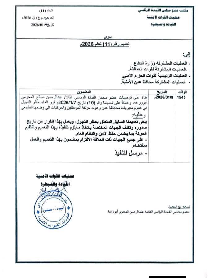 عدن /14أكتوبر:أعلنت عمليات القوات الأمنية، اليوم الجمعة، إنهاء حظر التجوال في عموم مديريات العاصمة المؤقتة عدن، وعودة حركة المواطنين والمركبات إلى وضعها الطبيعي، ابتداءً من اليوم.ووجه التعميم الجهات المختصة باتخاذ ما يلزم تنفيذه بهذا التعميم وتنظيم حركة السير بما يضمن حفظ الامن والنظام العام.* سبأنت