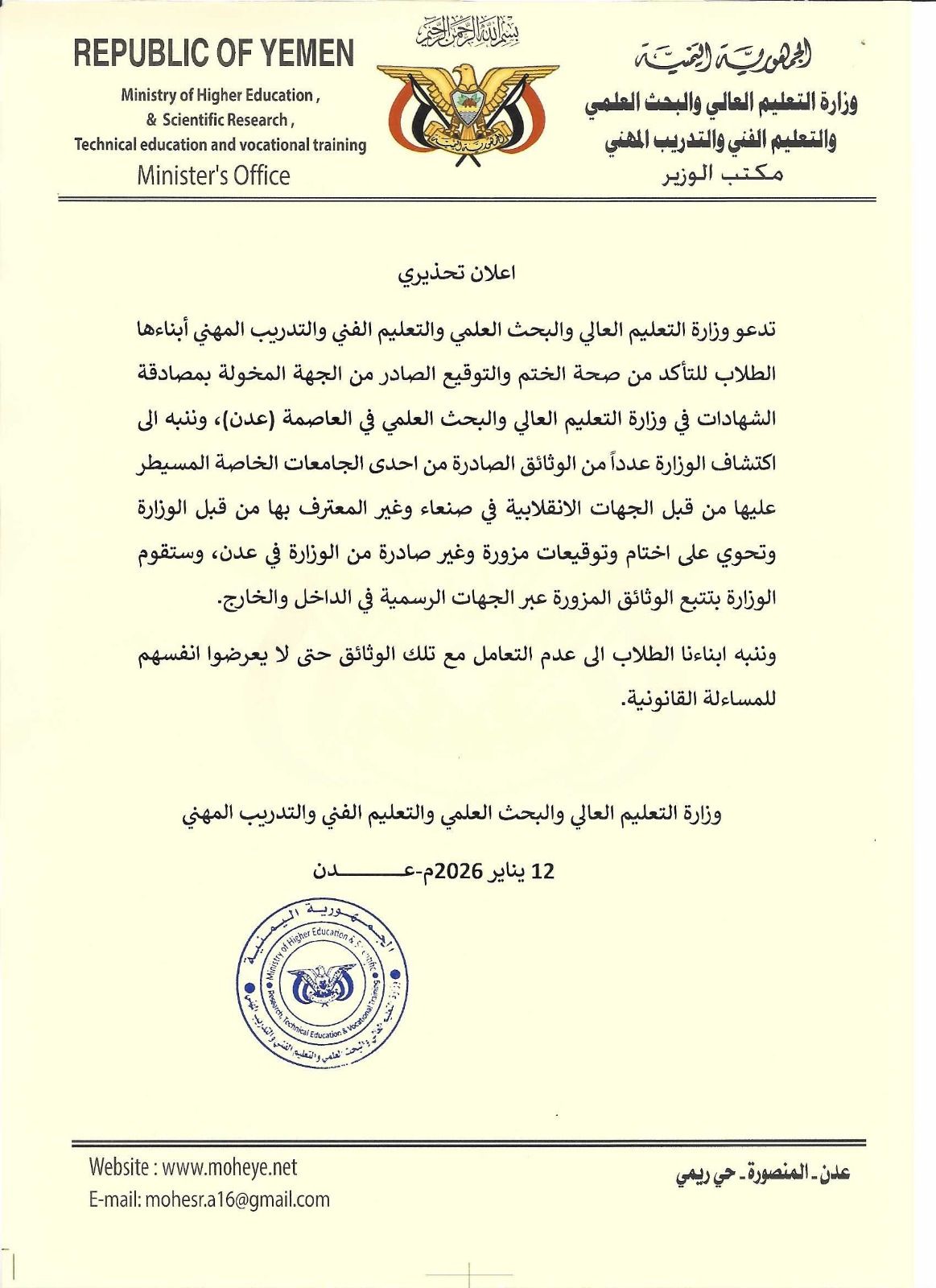 عدن/ 14أكتوبر/خاص:دعت وزارة التعليم العالي والبحث العلمي والتعليم الفني والتدريب المهني الطلاب للتأكد من صحة الختم والتوقيع الصادر من الجهة المخولة بمصادقة الشهادات في وزارة التعليم العالي والبحث العلمي في العاصمة (عدن).ونبهت الوزارة إلى اكتشاف عدد من الوثائق الصادرة من إحدى الجامعات الخاصة المسيطر عليها من قبل الجهات الانقلابية في صنعاء، وغير المعترف بها من قبل الوزارة، تحوي على أختام وتوقيعات مزورة وغير صادرة من الوزارة في عدن، مؤكدة أنها ستقوم بتتبع الوثائق المزورة عبر الجهات الرسمية في الداخل والخارج. ونبهت الوزارة الطلاب إلى عدم التعامل مع تلك الوثائق حتى لا يعرضوا أنفسهم للمساءلة القانونية.