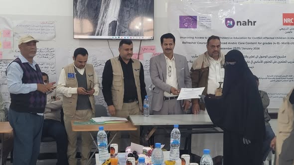 مأرب/14أكتوبر/خاص:اختتم نائب وزير التربية والتعليم الدكتور علي العباب، بمحافظة مأرب، البرنامج التدريبي لمعلمي ومعلمات المواد والمربين في مديرية مدينة مأرب، ضمن مشروع تحسين الوصول إلى تعليم وقائي جيد للأطفال المتأثرين بالنزاع في المحافظة.واستهدف البرنامج، الذي استمر على مدى 14 يومًا، ونفذته المؤسسة الوطنية للتنمية والاستجابة الإنسانية بالشراكة مع المجلس النرويجي للاجئين، وبتمويل من الاتحاد الأوروبي، تأهيل 310 من المعلمين والمعلمات، بهدف رفع كفاءاتهم وتطوير مهاراتهم التخصصية في المواد الأساسية.وهدف البرنامج إلى تعزيز قدرات معلمي مادتي اللغة العربية والرياضيات، باعتبارهما الأساس الذي يُبنى عليه التحصيل العلمي في مختلف المراحل الدراسية، إلى جانب تزويد المشاركين بأساليب تعليم حديثة، وتنمية مهاراتهم التربوية، وتشجيعهم على توظيف التكنولوجيا الحديثة والإنترنت في العملية التعليمية، بما يسهم في تحسين مستوى الأداء داخل الصفوف الدراسية، وينعكس إيجابًا على تحصيل الطلاب العلمي.وفي الاختتام، أكد نائب وزير التربية والتعليم، أهمية هذه البرامج النوعية التي تسهم في الارتقاء بالعملية التعليمية، لا سيما في ظل الظروف الاستثنائية التي تمر بها البلاد، مشيرًا إلى أن المعلم المؤهل والمدرب يمثل حجر الزاوية في أي عملية إصلاح تعليمي، مشددا على ضرورة استمرار المعلمين في تطوير قدراتهم الذاتية، ومواكبة المستجدات التربوية، والاستفادة من الوسائل التقنية الحديثة، بما يعزز من جودة التعليم ويساعد على بناء جيل واعٍ وقادر على مواجهة التحديات، مشيدًا بجهود الجهات المنفذة والداعمة، ودور الشركاء الدوليين في دعم مثل هذه البرامج التي تستهدف تحسين جودة التعليم والتخفيف من آثار النزاع على الأطفال في محافظة مأرب.حضر حفل الاختتام مدير إدارة التربية بمدينة مأرب محمد مارش، والمدير التنفيذي للمؤسسة الوطنية للتنمية والاستجابة الإنسانية - مكتب مأرب المهندس محمد الرياشي، ومدير المشروع الدكتور فيصل جراد.