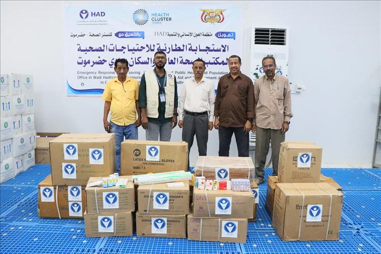 سيئون /14أكتوبر:تسلّم مكتب الصحة العامة والسكان بوادي وصحراء حضرموت، اليوم، شحنة من أدوية الطوارئ مقدمة من منظمة العون الإنساني والتنمية (HAD)، بالتنسيق مع كلستر الصحة – حضرموت، ضمن الاستجابة الطارئة لدعم القطاع الصحي.وأشاد مدير مكتب الصحة بوادي وصحراء حضرموت، الدكتور هاني العمودي، بدور المنظمة في تلبية الاحتياجات العاجلة لأقسام الطوارئ، والعناية المركزة، وأدوية الأمراض المزمنة..مثمناً الشراكة المستمرة منذ العام 2017م.من جانبه أوضح مدير مكتب منظمة HAD بحضرموت، نزار باعبيد، أن المساعدة تأتي في اطار خطة الاستجابة الطارئة للمنظمة، لتوفير الأدوية الأساسية بالتنسيق مع كلستر الصحة بحضرموت.*سبأنت