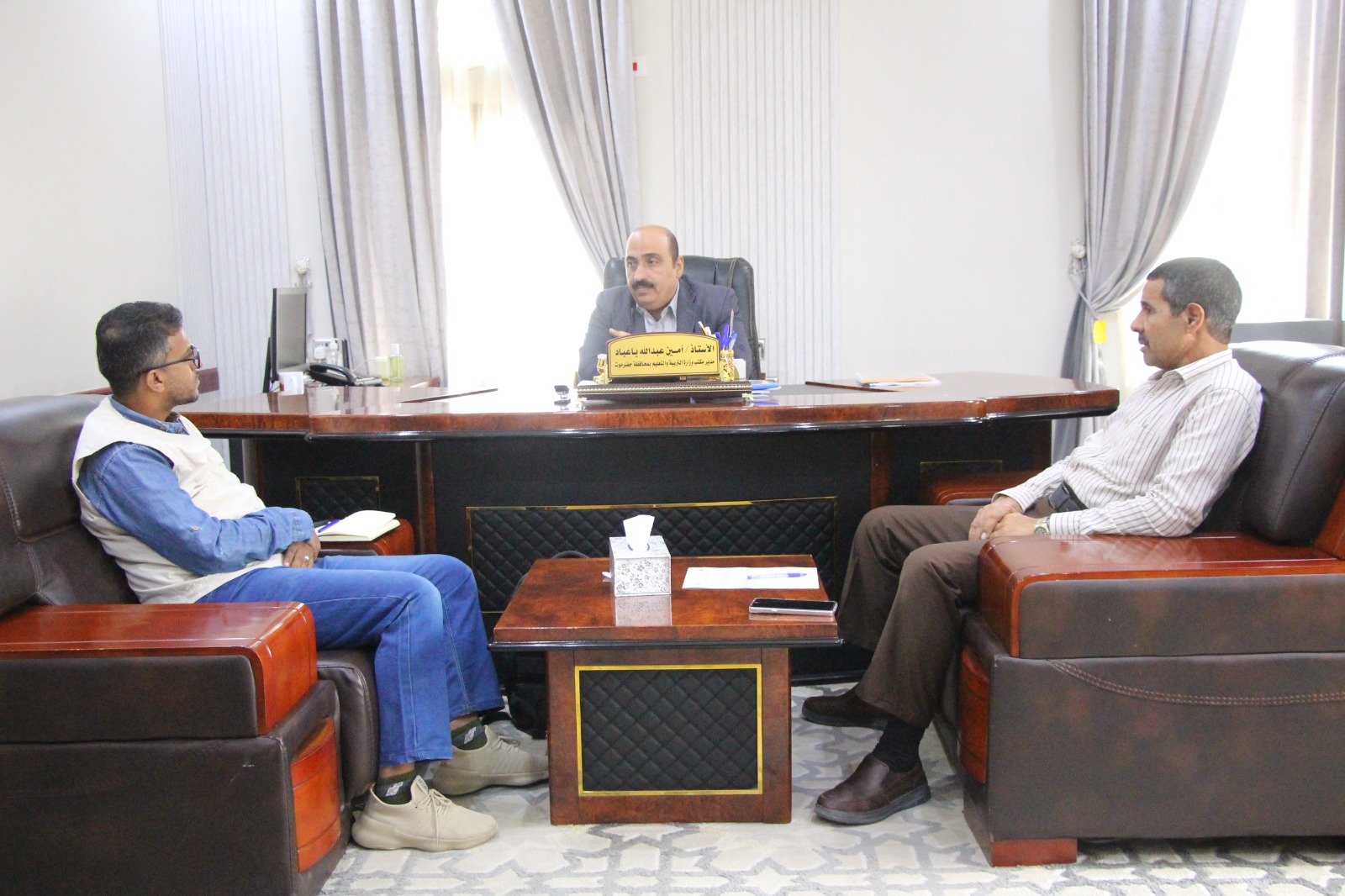 المكلا/14أكتوبر/خاص:التقى مدير مكتب وزارة التربية والتعليم بساحل حضرموت، أمين باعباد، اليوم، بمدير الوحدة التنفيذية لإدارة مخيمات النازحين في المحافظة محمد باجبير، وذلك لبحث آلية التعاون في جمع بيانات النازحين بين المكتب والوحدة في القطاع التربوي والتعليمي.وأكد باعباد على أهمية اللقاء الذي يأتي في إطار تحديد الاحتياجات من المشاريع والبرامج التربوية والتعليمية التي تخص شرائح النازحين على مستوى المديريات، موضحاً أن وجود عدد كبير من النازحين في المحافظة شكل ضغط على الخدمات ولا سيما الخدمات التعليمية.وأوضح أن المكتب لديه بيانات وإحصائيات دقيقة ويعمل على آلية لحصر عدد النازحين وأماكن تواجدهم في مديريات المحافظة كافة، مشددا على ضرورة التعاون المشترك بين الجانبين والجهات الداعمة، لما فيه المصلحة العامة ولتوفير بيئة تعليمية للنازحين على مستوى المديريات. بدوره عبر باجبير عن شكره لاهتمام قيادة مكتب التربية بالمحافظة، مؤكداً على حرص الوحدة على عمل آلية مستحدثة لتوفير البيانات الخاصة بالنازحين والوافدين من مختلف محافظات الجمهورية.