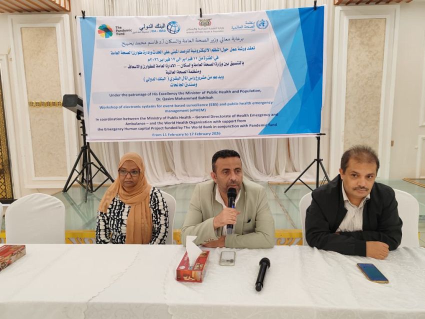 بدأت بالعاصمة المؤقتة عدن، اليوم، فعاليات ورشة العمل الخاصة بالنظم الإلكترونية للرصد المبني على الحدث وإدارة طوارئ الصحة العامة، التي تنظمها الإدارة العامة للطوارئ والإسعاف بوزارة الصحة العامة والسكان، بالتنسيق مع منظمة الصحة العالمية، بدعم من مشروع رأس المال البشري والبنك الدولي وصندوق الجائحات، في إطار الجهود الرامية إلى تعزيز منظومة الإنذار المبكر والاستجابة السريعة للطوارئ الصحية في البلاد.