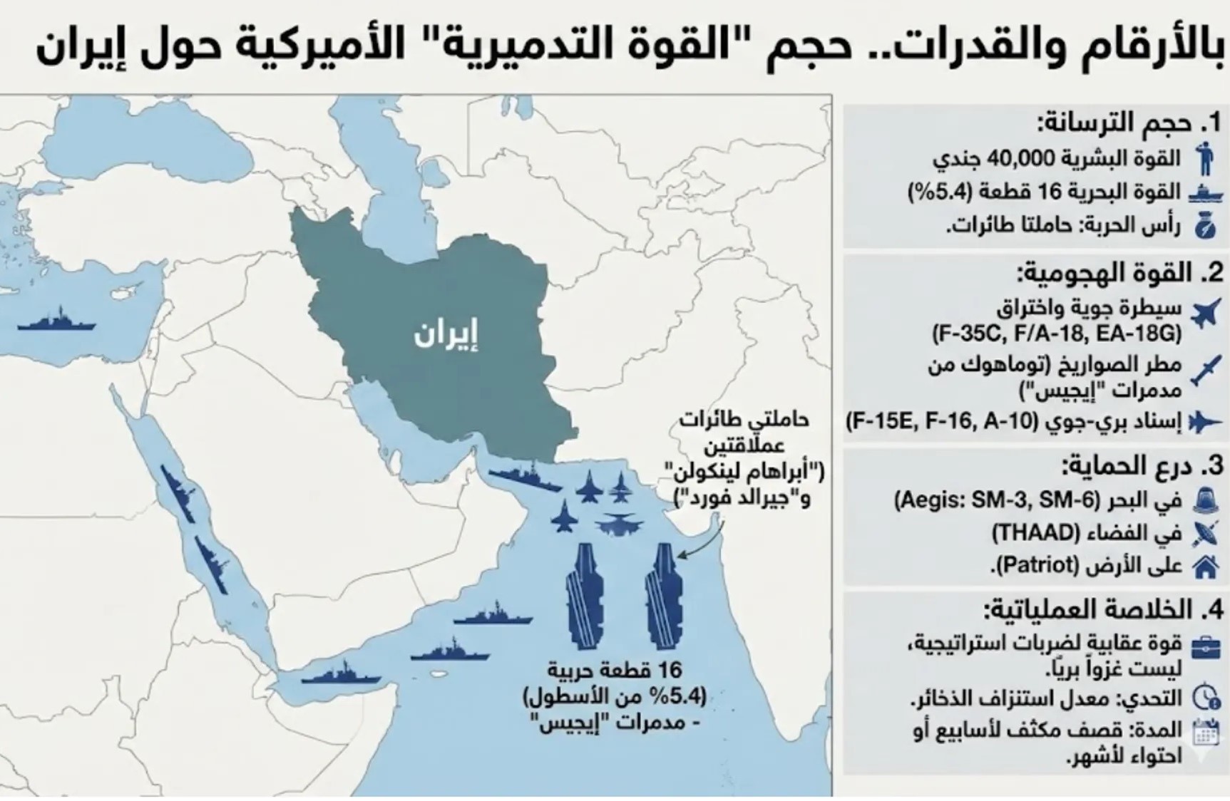 وآليات مدرعة، في حين نشرت الولايات المتحدة في المنطقة حشداً بحرياً وجوياً كبيراً، مع إبقاء احتمال توجيه ضربات ضد إيران قائماً.