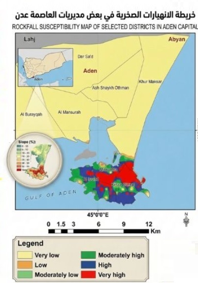 عدن/14أكتوبر/خاص:أصدر مختصون في نظم المعلومات الجغرافية بهيئة المساحة الجيولوجية والثروات المعدنية بعدن، خريطة علمية حديثة توضح مناطق القابلية للانهيارات الصخرية في عدد من مديريات العاصمة عدن، وذلك في إطار جهود الهيئة لرصد المخاطر الطبيعية وتعزيز السلامة العامة.وجرى إعداد الخريطة بالاعتماد على تحليل بيانات نموذج الارتفاع الرقمي (DEM) عبر منصة Google Earth Engine (GEE)، ودراسة درجات الانحدار والعوامل الطبوغرافية المؤثرة في استقرار المنحدرات، إلى جانب تنفيذ نزول ميداني لفريق الانهيارات الصخرية والجيوتكنك للتحقق من المواقع ذات الخطورة المرتفعة.وأظهرت النتائج وجود مناطق مصنفة ضمن مستوى خطورة عالية وعالية جداً، خاصة في نطاق المرتفعات الجبلية القريبة من التجمعات السكانية.ودعت الهيئة الجهات المختصة والمواطنين إلى تجنب البناء العشوائي بالقرب من المنحدرات الصخرية، وإجراء دراسات جيوتكنيكية قبل تنفيذ أي مشاريع إنشائية، وتوخي الحذر خلال مواسم الأمطار وبعد الهزات الأرضية.وأكدت استمرارها في استخدام التقنيات الحديثة وربطها بالتحقق الميداني لإنتاج خرائط دقيقة تدعم التخطيط الآمن، وحماية الأرواح والممتلكات في العاصمة عدن.