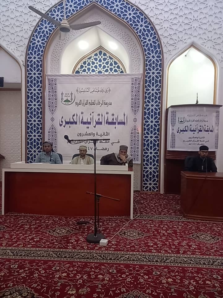 تقيم مدرسة الرحاب لتعليم القرآن الكريم عقب صلاة عصر هذا اليوم الأحد حفل تكريم لـ (83) طالبـًا من عموم مديريات محافظة عدن، عقب انتهاء المسابقة التي أقيمتم خلال (22) يومـًا، التي بدأت منذ غرة رمضان 1447هـ الجاري، والتي انتهت يوم الأربعاء الماضي الثاني والعشرين من رمضان.