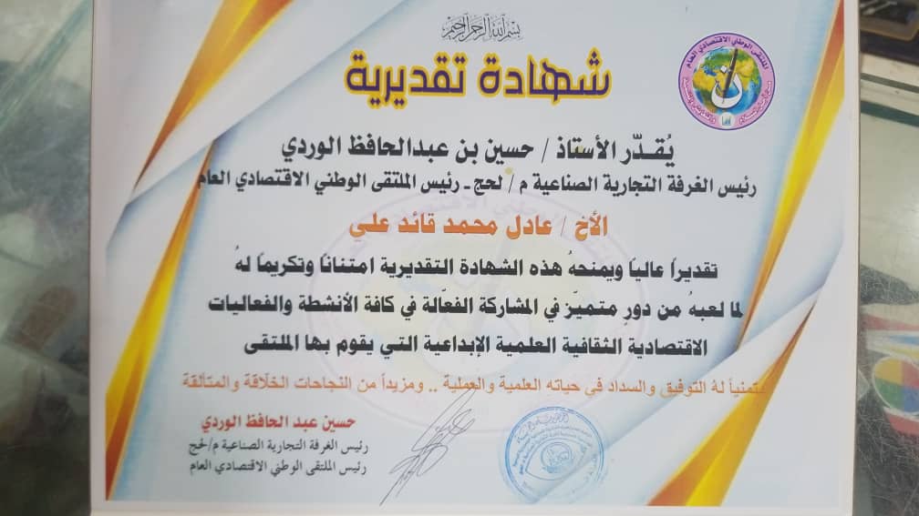 لحج/14أكتوبر/خاص: كرّم الملتقى الوطني الاقتصادي العام بمحافظة لحج الزميل عادل محمد قائد، مدير مكتب صحيفة «14 أكتوبر» بالمحافظة، بمنحه شهادة تقديرية تقديراً لدوره المتميز ومشاركته الفاعلة في الأنشطة الاقتصادية والثقافية والعلمية والإبداعية التي ينظمها الملتقى.وجاء هذا التكريم تقديراً لإسهامات الزميل عادل قائد في الحضور الإعلامي والمجتمعي، ومشاركته في الفعاليات والأنشطة التي تسهم في تعزيز الوعي الاقتصادي والثقافي، وتشجيع المبادرات الإبداعية التي تخدم المجتمع المحلي في محافظة لحج.من جانبه عبّر الزميل عادل محمد قائد عن شكره وتقديره للملتقى الوطني الاقتصادي العام بلحج على هذه اللفتة التكريمية، معتبراً أن هذا التكريم يمثل دافعاً لمواصلة العمل والعطاء في المجال الإعلامي.كما وجّه شكره لقيادة مؤسسة 14 أكتوبر للصحافة والطباعة والنشر على دعمها المستمر لمنتسبيها وحرصها على تعزيز الدور الإعلامي للمؤسسة في نقل مختلف القضايا والفعاليات المجتمعية، مؤكداً أن هذا التكريم هو تقدير لجهود صحيفة «14 أكتوبر» ورسالتها الإعلامية في خدمة المجتمع.