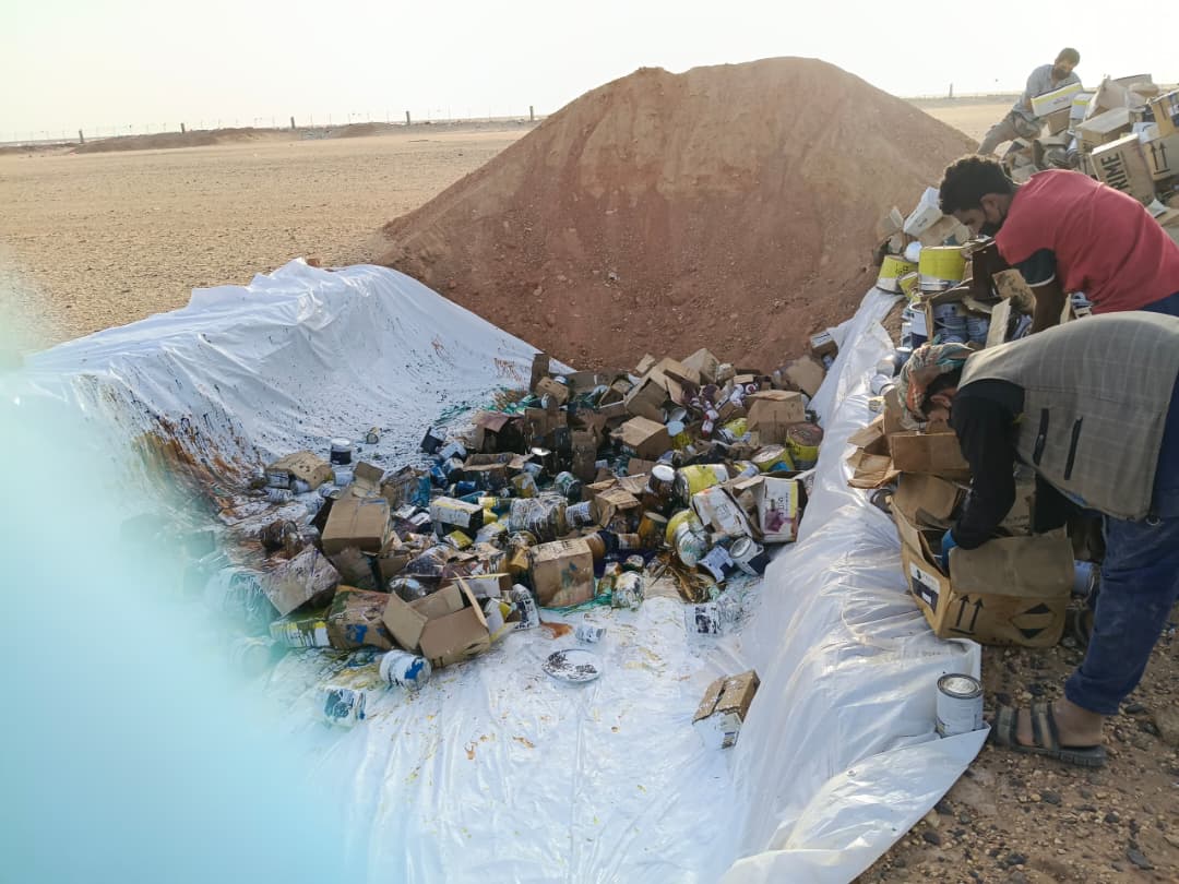 وشملت المواد التي تم إتلافها 14,130 لترًا من مادة الميثانول ومواد الطلاء، و73,200 قرص من الأدوية المتنوعة، بينها (سولبادين وبنادول)، إضافة إلى 4,943 كرتون سجائر، فضلًا عن كميات من المواد الغذائية ومواد التغليف المنتهية الصلاحية.