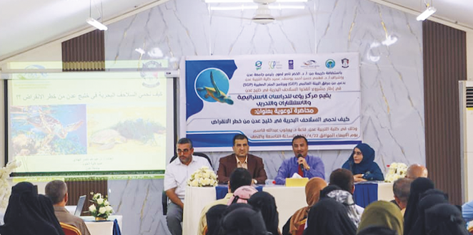نظم مركز رؤى للدراسات الاستراتيجية والاستشارات والتدريب محاضرة توعوية بعنوان: «كيف نحمي السلاحف البحرية في خليج عدن من خطر الانقراض»، برعاية الأستاذ الدكتور الخضر ناصر لصور، رئيس جامعة عدن، وبإشراف الأستاذ الدكتور فهمي حسن أحمد يوسف، عميد كلية التربية عدن، وبدعم من مرفق البيئة العالمي (GEF) وبرنامج المنح الصغيرة (SGP)،