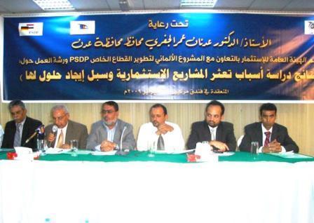 عدن/جمال عرب :نظمت صباح أمس بفندق ميركيور بمحافظة عدن ورشة عمل حول: نتائج دراسة أسباب تعثر المشاريع الاستثمارية وسبل إيجاد حلول لها) والتي نظمتها الهيئة العامة للاستثمار بالتعاون مع المشروع الألماني لتطوير القطاع الخاص psop برعاية الدكتور عدنان عمر الجفري محافظ محافظة عدن.
