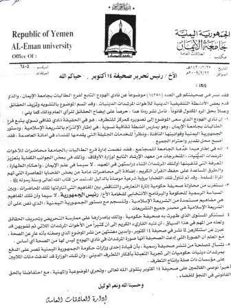 تلقت الصحيفة مساء أمس الخميس 26/2/2009م عبر الفاكس رداً من جامعة الإيمان على خبر نشرته بحسب المعايير والأعراف المهنية مع ذكر مصدره (نبأ نيوز) في عددها الصادر يوم السبت 24 يناير 2009م حول احتشاد (70) مرشدة في مقر الاتحاد العام لنساء اليمن، شكون من تعبئتهن في هودج تابع لجامعة (الإيمان) بأفكار تناهض حقوق المرأة في العمل وتولي وظائف الولاية العامة في المناصب الوزارية والدبلوماسية والبرلمانية والقضاء وهو ما يتعارض مع البرنامج الانتخابي لفخامة الرئيس ولكل ما تتطلع إليه الدولة اليمنية الحديثة.وتضمن التقرير الإخباري الذي نشرته الصحيفة نقلاً عن (نبأ نيوز) - بحسب الأعراف الصحفية المرعية - تأكيداً من المكتب التنفيذي لاتحاد نساء اليمن يفيد بتعرض مرشدات دينيات يتبعن وزارة الأوقاف لعمليات غسل دماغي، مع تصريح للأخت/ رمزية الإرياني رئيسة الاتحاد العام لنساء اليمن أكدت فيه أن أبواب الاتحاد مفتوحة لكل الأخوات المرشدات واستعداده لتقديم أي مساعدة مطلوبة.ويصر الرد الذي وصلنا من الجامعة مساء أمس على أن المحاضرات التي ألقيت على المرشدات في نادي (الهودج) التابع لجامعة الإيمان انطلقت من رؤية شرعية موصلة بالدليل ومستمدة من الشريعة الإسلامية التي يلتزم بها الدستور اليمني، في إشارة إلى تمسك الجامعة بآراء شيوخها الذين ينكرون حق المرأة في العمل وتولي وظائف الولاية العامة ويعتبرون ذلك مخالفاً للشريعة الإسلامية وللدستور، على عكس ما هو معمول به في اليمن وكل البلدان الإسلامية وبضمنها بلدان مجلس التعاون الخليجي وعلى رأسها المملكة العربية السعودية التي فتحت مجال العمل واسعاً أمام النساء وعينت أول امرأة في منصب وزاري منتصف هذا الشهر، مع الأخذ بعين الاعتبار أن كل البلدان الإسلامية التي تعلن التزامها بالشريعة الإسلامية لا تتفق مع من ينكرون حق المرأة في العمل وتولي وظائف الولاية العامة، باستثناء شريعة (إمارة طالبان) سيئة الصيت.وجاء رد جامعة الإيمان بأسلوب يوحي بأنها تمثل - حصرياً - صاحبة الحق في تعريف الشريعة الإسلامية وتطعن كل من يخالف رؤية وأفكار شيوخها الذين يتمسكون بوجهات نظرهم وآرائهم الخاضعة للنقد والنقض والخلاف ، ويستغربون ــ في الوقت نفسه ــ من مخالفيهم ما وصفتها رسالة الرد بـ (محاولة إثارة التعارض والتناقض بين المفاهيم التي تناولتها تلك المحاضرات ، وبين السياسة الرسمية للجمهورية اليمنية التي يلتزم دستورها بالشريعة الاسلامية كمصدر لجميع التشريعات) بحسب ما جاء في الرد الذي يوحي أسلوبه باحتكار تعريف الشريعة الاسلامية لشيوخ جامعة الايمان من دون غيرهم !!.ولما كانت الصحف تنشر تقارير إخبارية نقلاً عن مصادرها فإنها ليست معنية بالرد على التقارير الإخبارية التي تنشرها إلى جانب صحف ومواقع إخبارية عديدة، ويتم فيها الالتزام بذكر المصدر، خصوصاً إذا جاء الرد متأخراً جداً بعد شهر من نشره(!!!).وكان الأحرى بالإخوة في جامعة (الإيمان) إرسال الرد في حينه إلى مصدر الخبر (نبأ نيوز) ونفي أو تأكيد ما جاء على لسان المكتب التنفيذي للاتحاد العام لنساء اليمن والأخت رمزية الإرياني رئيسة الاتحاد، علماً بأن الخبر تداولته صحف ومواقع إخبارية عديدة كان من بينها صحيفة (14 أكتوبر).كما كان حرياً بالجامعة ألا تتأخر كثيراً - لمدة شهر- عن توضيح موقفها مما نشرته الصحف والمواقع الإخبارية حول هذا الموضوع، وبوسع الصحيفة - إذا أرادت الجامعة - إعادة فتح هذا الملف حتى يعرف الرأي العام حقيقة ما جرى في ذلك الهودج، والتعرف على آراء المرشدات اللاتي احتشدن في مقر الاتحاد العام لنساء اليمن للشكوى من الأفكار التي تم تعبئتهن بها في (هودج) جامعة الإيمان ورأي قيادة الاتحاد بهذا الشأن.