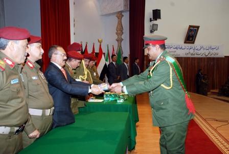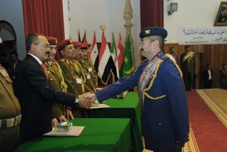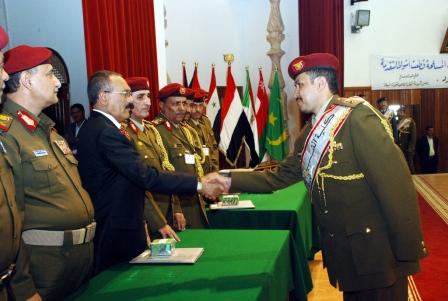 وأثنى الأخ الرئيس على كل الجهود الوطنية التي بذلت في سبيل تحقيق تلك الإنجازات من كل المحبين والمخلصين لهذا الوطن والذين يضعون مصالح الوطن العليا فوق أية اعتبارات أو مصالح ضيقة أو أنانية أو ذاتية وفي مقدمتهم ذلك المنتسبون إلى هذه المؤسسة العسكرية الوطنية الكبرى التي تحطمت وتتحطم على صخرة وعيها الوطني وعلى صخرة علم ومعرفة منتسبيها كل المؤامرات التي تحاك لزعزعة الأمن والاستقرار.وقال :«ابعد عليهم من عين الشمس أن يزعزعوا أمن واستقرار هذا الوطن بفضل هذه الصحوة وبفضل تلاحم المؤسسة العسكرية مع أبناء الوطن وبفعل أبناء الوطن الذين هم الرديف لهذه المؤسسة العسكرية والذين يدعمون كل يوم من الخريجين من المعاهد والمدارس بشباب ولاؤهم لهذا الوطن وحبهم لهذا الوطن لا لأشخاص ولا الحزب ولا القبيلة وإنما لوطن الـ 26 من سبتمبر والـ 14 من أكتوبر والـ 22 من مايو».وهنأ فخامة الأخ الرئيس الخريجين من هذه الدفع و الملتحقين بالأكاديمية من منتسبي المؤسسة العسكرية الذين يتم تعزيز معارفهم بالعلوم المختلفة وإكسابهم المعلومات الحديثة والمتطورة التي يحصلون عليها في شتى العلوم والمعارف العسكرية ، وقال:»لقد انتهي وقت الهرجلة وحان وقت المعرفة والعلوم الحديثة وقت الإطلاع والمتابعة لكل المستجدات في العلوم العسكرية ».وأشاد الأخ الرئيس بجهود كل أنباء القوات المسلحة والأمن الذين يتصدون كل يوم للعناصر الإرهابية والعناصر الجاهلة المأجورة التي تسعى إلى زعزعة أمن واستقرار الوطن .وقال:« لم و لن نعتمد على الأمن القومي والأمن السياسي فحسب وإنما نعتمد على أبناء وطننا فهم الأمن القومي وهم أصحاب المصلحة الحقيقية في الأمن والاستقرار والتنمية ».وأضاف:« لا تنمية بدون أمن واستقرار على الإطلاق, ولا تعليم ولا جامعات ولا أكاديميات ما لم توجد مؤسسة عسكرية حديثة متطورة ولاؤها لهذا الوطن وترفد بالقوى الشريفة والمخلصة من أبناء هذا الوطن» .ووجه فخامة الأخ الرئيس الشكر للمدرسين في الأكاديمية من أبناء الوطن ومن الأشقاء في جمهورية موصر العربية وجمهورية العراق وكل من ساهم في تأهيل وتخريج هذه الدفع .وأعلن فخامة الأخ الرئيس تسمية الدفع المتخرجة بدفع صمود الشعب الفلسطيني الذي واجه الصلف الصهيوني بكل بسالة خصوصا خلال عدوانه الأخير على قطاع غزة, مجددا التهاني للخريجين ومتمنيا للجميع التوفيق والنجاح في مهامهم العملية .