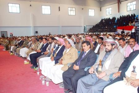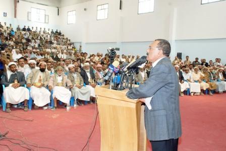 وأضاف” جمعتكم اليوم يا ابناء محافظات الجوف وشبوة ومأرب لأقول لكم جميعا انتم يا ابناء مثلث الخير والعطاء والرجال الاوفياء حاربوا الارهاب ولا تجاملوا».وتابع فخامته:”لقد جئت اليكم لأنبهكم من خطورة تعطيل التنمية وقتل الجنود ، كما حدث في وادي عبيده” ، وقال متسائلا: لماذا هذا؟ فالجنود يحافظون على الامن ويساعدون في نصب اعمدة الطاقة الكهربائية التى سيستفيد منها ابناء مأرب والجوف وشبوه وحضرموت وصنعاء وابين وعدن وكل الوطن باعتبار ذلك مصلحة للشعب دون استثناء.وقال” هذه مصالح الأمة ، فهل هناك من يريد ان يعيدنا الى المربع رقم واحد ايام الجهل والفقر والانغلاق، فاليمن اليوم توحد واصبح تعداده اثنين وعشرين مليون نسمة، ليمثل بذلك نموذجا في العالم العربي والاسلامي».