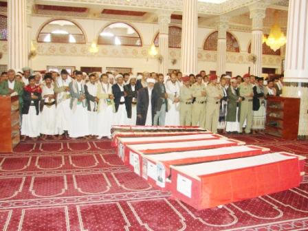 صنعاء / سبأ :شيع يوم أمس الأربعاء جثمانا شهيدي الواجب الجندي رضوان احمد الخالدي والجندي عادل علي العمري من اللواء 3مشاة جبلي حرس جمهوري اللذين استشهدا وهما يؤديان واجبهما الوطني في جبل الصمع مديرية أرحب محافظة صنعاء على أيدي العناصر الخارجة على النظام والقانون.كما شيعت جثامين الشهداء الرائد مسعد محمد صالح العنسي والرائد صالح ناصر القلام والجندي احمد عبده العماد والجندي بشير محمد الثلايا من قوات اللواء 25ميكا الذين اغتالتهم أيادي الغدر والخيانة من العناصر الإرهابية التابعة لتنظيم القاعدة الإرهابي في مدينة زنجبار محافظة أبين.وخلال مراسيم التشييع التي تقدمها نائب رئيس هيئة الأركان العامة لشئون العمليات اللواء الركن علي محمد صلاح نددت جماهير المشيعين من القيادات العسكرية والأمنية والشخصيات السياسية والاجتماعية بالأعمال الإجرامية والإرهابية التي تستهدف أبطال القوات المسلحة والمواطنين والأبرياء مطالبين الجهات المختصة بملاحقة تلك العناصر وتقديمها للعدالة لتنال جزاءها على ما اقترفته أياديها الآثمة بحق الوطن والمواطنين.وقد جرت مراسيم التشييع بعد الصلاة عليهم في جامع الشهداء بأمانة العاصمة حيث سار الموكب الجنائزي للشهداء، الذين لفت جثامينهم بالعلم الجمهوري تتقدمه كوكبة رمزية من ضباط وأفراد القوات المسلحة وحرس الشرف حاملين صور الشهداء الأبرار في موقف جسد معاني الوفاء والعرفان لتلك التضحيات والأدوار البطولية التي يجترحها أبطال القوات المسلحة في سبيل الوطن وأمنه واستقراره.وقد ووريت جثامينهم الطاهرة في مقبرة الشهداء بأمانة العاصمة.وشارك في التشييع عضوا مجلس النواب محمد مهدي الكويتي وعبدالكريم الأكوع ورئيس محكمة نهم وبني حشيش القاضي حفظ الله العمري .