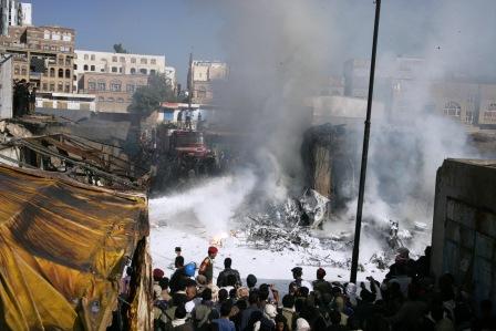رجال الأمن والدفاع المدني يخمدون النيران المشتعلة جراء تحطم الطائرة