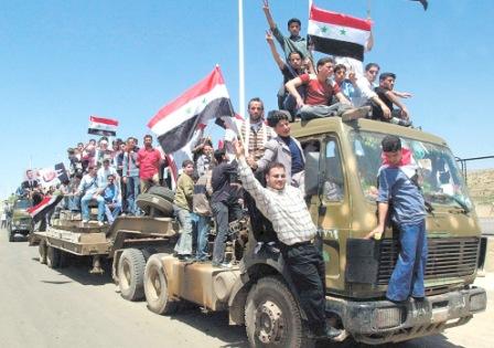 دمشق/ متابعات:تمكنت قوات من الجيش العربي السوري امس وفي إطار عملياتها العسكرية المتواصلة ضد الإرهابيين بمدينة القصير وريفها من القضاء على أعداد منهم وأحكمت السيطرة على أجزاء كبيرة من الحارتين الشمالية والوسطى من المدينة.كما سيطرت على مبنى المؤسسة الاستهلاكية والمسلخ ومبنى شعبة الحزب الحاكم ومديرية المنطقة بالجزء الشرقي من الحارة الشمالية بعد أن قضت على الإرهابيين الذين كانوا يتحصنون داخلها.وتم تدمير آخر أوكار الإرهابيين وتجمعاتهم في الحي الواقع جنوبي المقبرة بالحارة الوسطى من المدينة، وتفكيك عدد من العبوات الناسفة وتدمير أنفاق كان الإرهابيون يستخدمونها للتنقل وتخزين الأسلحة والذخيرة في الحارة الجنوبية.وأفاد مصدر عسكري سوري أن وحدات من الجيش العربي السوري دمرت عدداً من تجمعات الإرهابيين وأوكارهم بقرى الحيدرية وعرجون والضبعة بريف القصير بما فيها من أسلحة وذخيرة وأدوات إجرامية ، كما اقتحم بالكامل مطار الضبعة في شمال القصير .كما تم إيقاع قتلى ومصابين بصفوف المجموعات الإرهابية المسلحة في بلدات وقرى الدار الكبيرة والغنطو وتلبيسة والعامرية والناصرية.وفي حمص واصلت وحدات من القوات المسلحة عملياتها ضد المجموعات الإرهابية في أحياء الخالدية وجورة الشياح والحميدية والورشة والقرابيص والوعر، وأوقعت أعداداً من أفرادها قتلى ومصابين.وقضت وحدات من الجيش العربي السوري على عدد من الإرهابيين بينهم مرتزقة من جنسيات أجنبية، ودمرت أسلحتهم وذخيرتهم في سلسلة عمليات نفذتها امس ضد أوكارهم في حرستا وعربين ودوما في الغوطة الشرقية وجوبر وبرزة بريف دمشق.كما تم تدمير مدفع عيار 23 مضاد للطيران في عربين، وإيقاع أفراد مجموعة إرهابية بين قتيل ومصاب من بينهم: عمار القرصة وصلاح غنوم.ونفذت وحدة عسكرية عملية نوعية في مزارع العب بمنطقة دوما نجم عنها مقتل متزعم إحدى المجموعات الإرهابية (خالد طه) وعدد من أفراد مجموعته من بينهم: مهند حبش.وتم القضاء على عدد من الإرهابيين في حي البيدر بمدينة حرستا من بينهم: الإرهابي السعودي عثمان العسيري وسامي الحصوة وموفق عيون، وتدمير مخبأ للأسلحة والذخيرة في مزارع بسطرة ما بين دوما وحرستا.وفي جوبر أوقعت وحدة من القوات المسلحة قتلى ومصابين بين أفراد مجموعة إرهابية مسلحة شرق دوار المناشر، ودمرت أسلحة وذخيرة كانوا يستخدمونها بأعمالهم الإجرامية، ومن بين القتلى: ماهر جحا وعبد الله الحرح.إلى ذلك واصلت وحدات عسكرية عملياتها ضد أوكار الإرهابيين في حي برزة والمزارع المحيطة به وصادرت أسلحة وذخيرة، وأردت عدداً منهم قتلى، من بينهم: ناصر الهبول ومسعود الدريع.وفي ريف حماة تصدت وحدة من القوات المسلحة الليلة قبل الماضية وفجر امس لمجموعات إرهابية حاولت الاعتداء على قرية قبة الكردي بمنطقة السلمية، وأوقعت خسائر كبيرة في صفوفها.وقد حاولت المجموعات الإرهابية الدخول للقرية للاعتداء على الأهالي ونهب ممتلكاتهم قبل أن تتصدى لهم وحدة عسكرية، وتوقعهم قتلى ومصابين وتدمر أدوات إجرامهم، ومصادرة كميات كبيرة من الأسلحة الرشاشة والذخيرة كانت بحوزتهم.اما في محافظة إدلب فقد دمرت وحدات من الجيش العربي السوري امس عدة أوكار وتجمعات للإرهابيين في ريف أبو الظهور بمن فيها من إرهابيين وأسلحة وذخائر ومعدات إجرامية.فقد تم القضاء بسلسلة عمليات نوعية على عدد من تجمعات للإرهابيين في قرى المجاص وأم جرين وتل سلمو والجهة الشمالية لمطار أبو الظهور وتدمير أسلحتهم وذخيرتهم بينها مدفع عيار23 مم مضاد للطائرات.وألحقت وحدات من القوات المسلحة خسائر كبيرة بتجمعات للإرهابيين في أم الغار والجانودية والشغر والعطشانة وكفرنبل وسراقب وجدار بكفلون والمحاميل ومعرتمصرين ومدرسة السياقة وسيجر.وفي جبل الأربعين قضت وحدة عسكرية، على مجموعات إرهابية كانت تقوم بأعمال قطع للطرقات وسلب ونهب في كفرلاتة وسرجة، ودمرت عدداً من آلياتهم ومعدات إجرامهم.من جانب آخر، نشب اقتتال بين مجموعتين إرهابيتين داخل أحد 