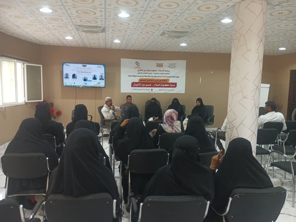 نظمت اللجنة الوطنية للمرأة في مدينة المكلا بحضرموت تزامنا مع اليوم العالمي للسلام ندوة "حكايات السلام.. جسور بين الأجيال" المنعقدة تحت شعار (حكاياتنا خطواتنا للسلام)، بالشراكة مع مؤسسة صحافة السلام، وذلك برعاية كريمة من محافظ المحافظة حضرموت مبخوت مبارك بن ماضي.
