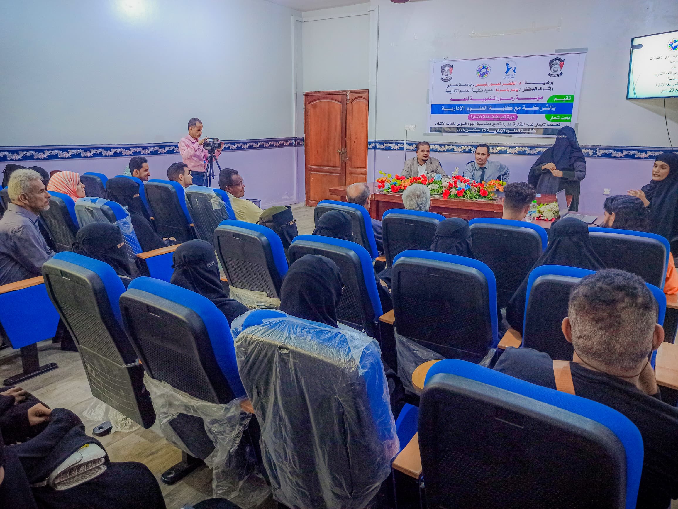 نظّمت مؤسسة رموز التنموية للصم بالشراكة مع كلية العلوم الإدارية بجامعة عدن، دورة تدريبية تعريفية بلغة الإشارة، استهدفت موظفي الكلية وعدد من أعضاء هيئة التدريس والطلاب، تحت شعار: "الصمت لا يعني عدم القدرة على التعبير"، وذلك بالتزامن مع اليوم الدولي للغات الإشارة.