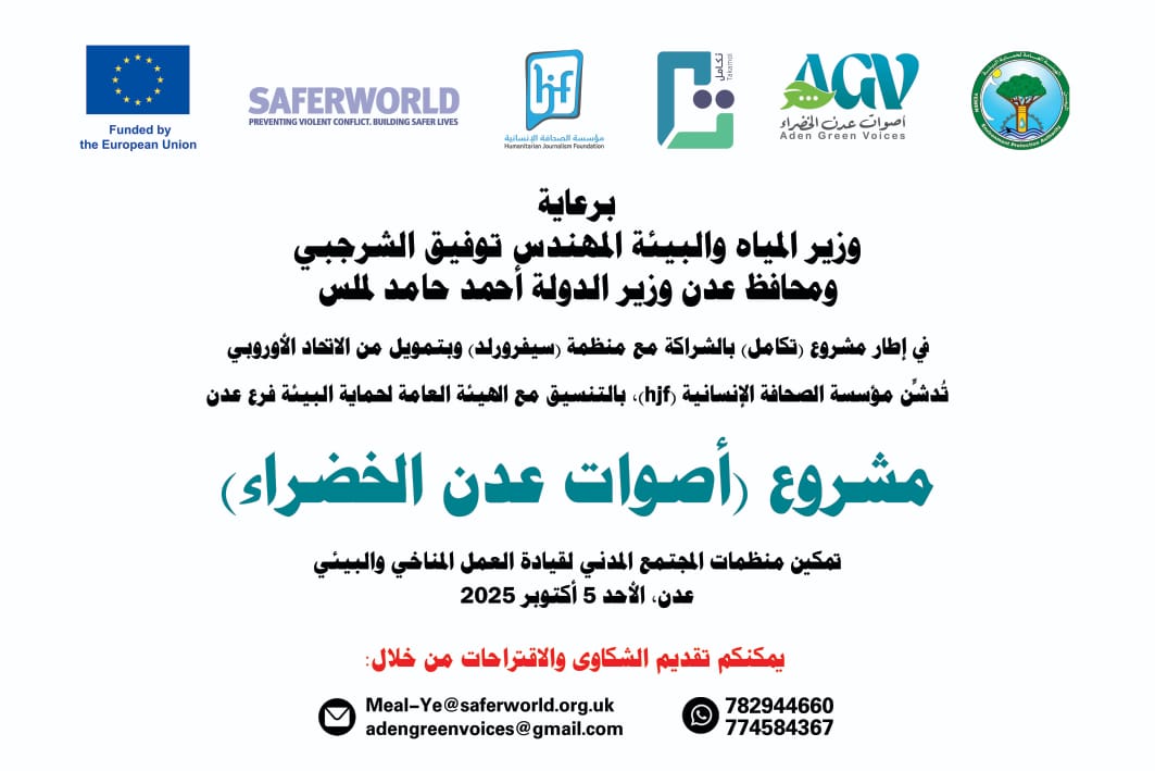 تستعد مؤسسة الصحافة الإنسانية (hjf) لتدشين مشروع «أصوات عدن الخضراء» غداً الأحد 5 أكتوبر 2025، في حفل يقام برعاية معالي وزير المياه والبيئة م. توفيق الشرجبي ومعالي وزير الدولة محافظ العاصمة عدن أحمد حامد لملس.