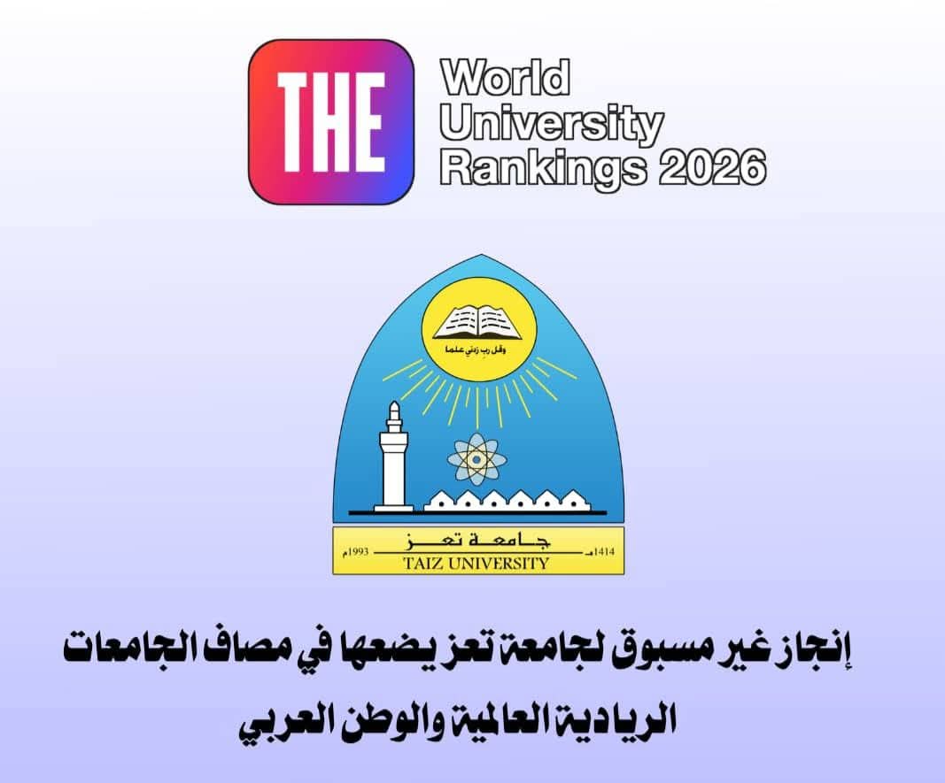 في إنجاز أكاديمي غير مسبوق على مستوى الجامعات اليمنية أعلنت جامعة تعز رسميًا عن دخولها ضمن تصنيف التايمز البريطاني العالمي للجامعات (Times Higher Education – World University Rankings 2026)، لتصبح أول وأفضل جامعة يمنية تُدرج في هذا التصنيف العالمي المرموق الذي يُعد من أبرز المؤشرات الدولية لتقييم جودة التعليم والبحث العلمي والابتكار في مؤسسات التعليم العالي حول العالم.